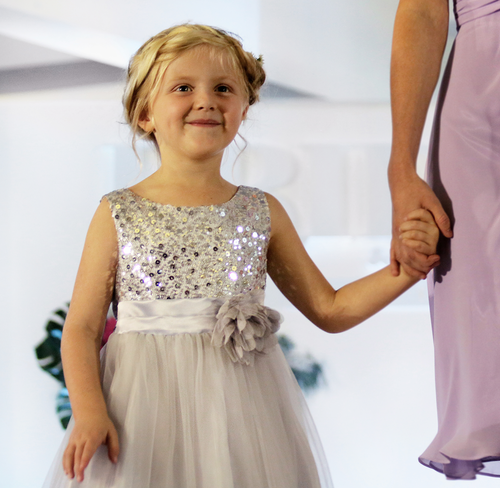 Sequin top, tulle skirt with ribboning on the edge. Zip up back.
