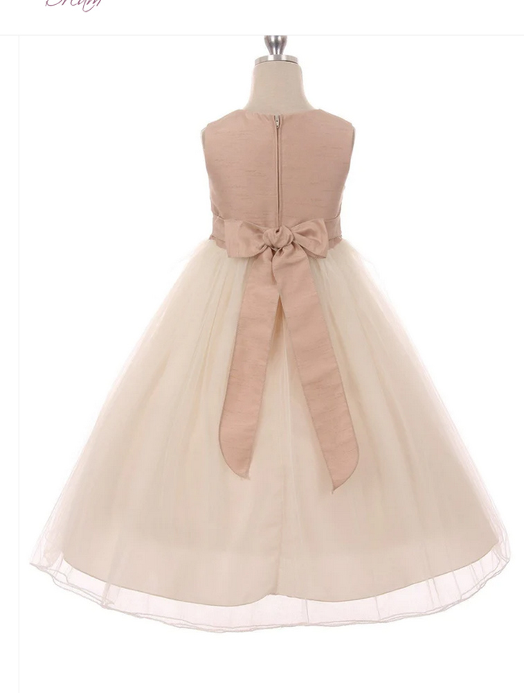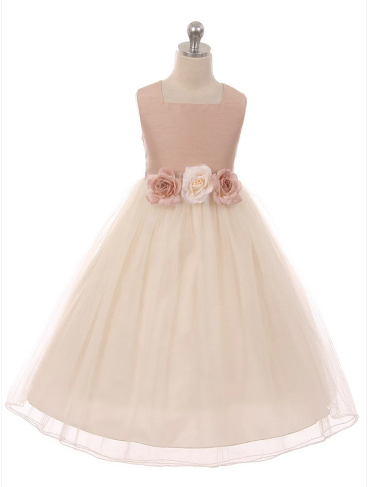 Classic flower girl dress. Textured silk like bodice with tulle skirt. Comes with three elegant flowers on waist. Flower colours may vary from those pictured.