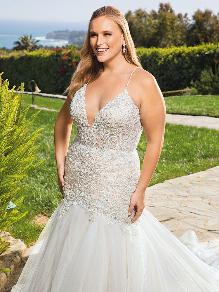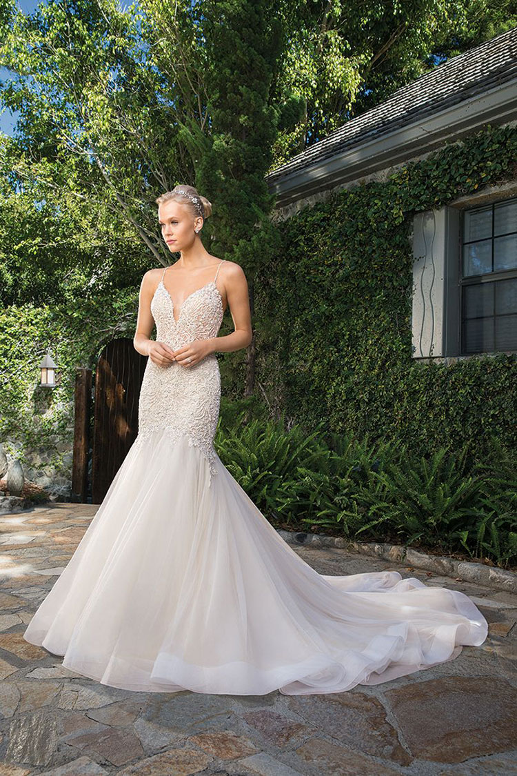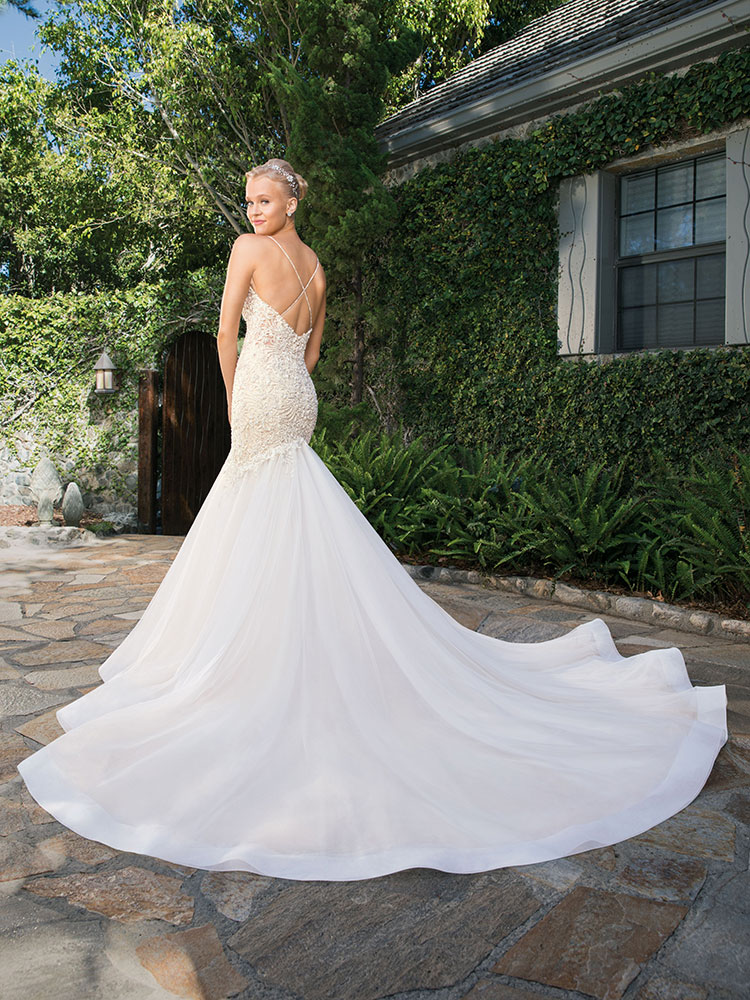 Curvaceous Clara is sexy and refined, her fit and flare silhouette flourishing into a voluminous soft tulle skirt that flows into a semi-cathedral-length train. Silver beading adorns the bodice of this Casablanca Bridal gown, stretch chiffon and organza sitting underneath her extravagantly detailed pattern. Spaghetti straps cross in the back, transitioning into a low-plunge front neckline.