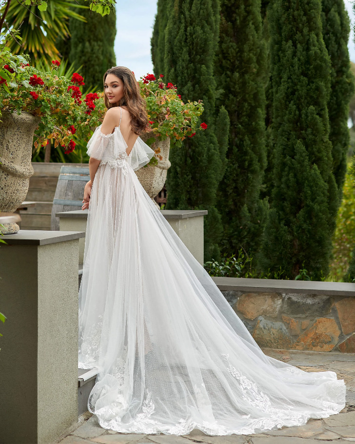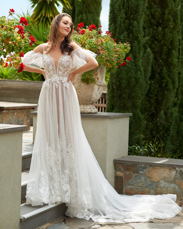 A feminine gown with a fashion forward edge, this tulle A line gown with fitted underskirt is perfect for the modern bride. Plunging bodice is finished with striking silver elements and beaded botanical lace.
