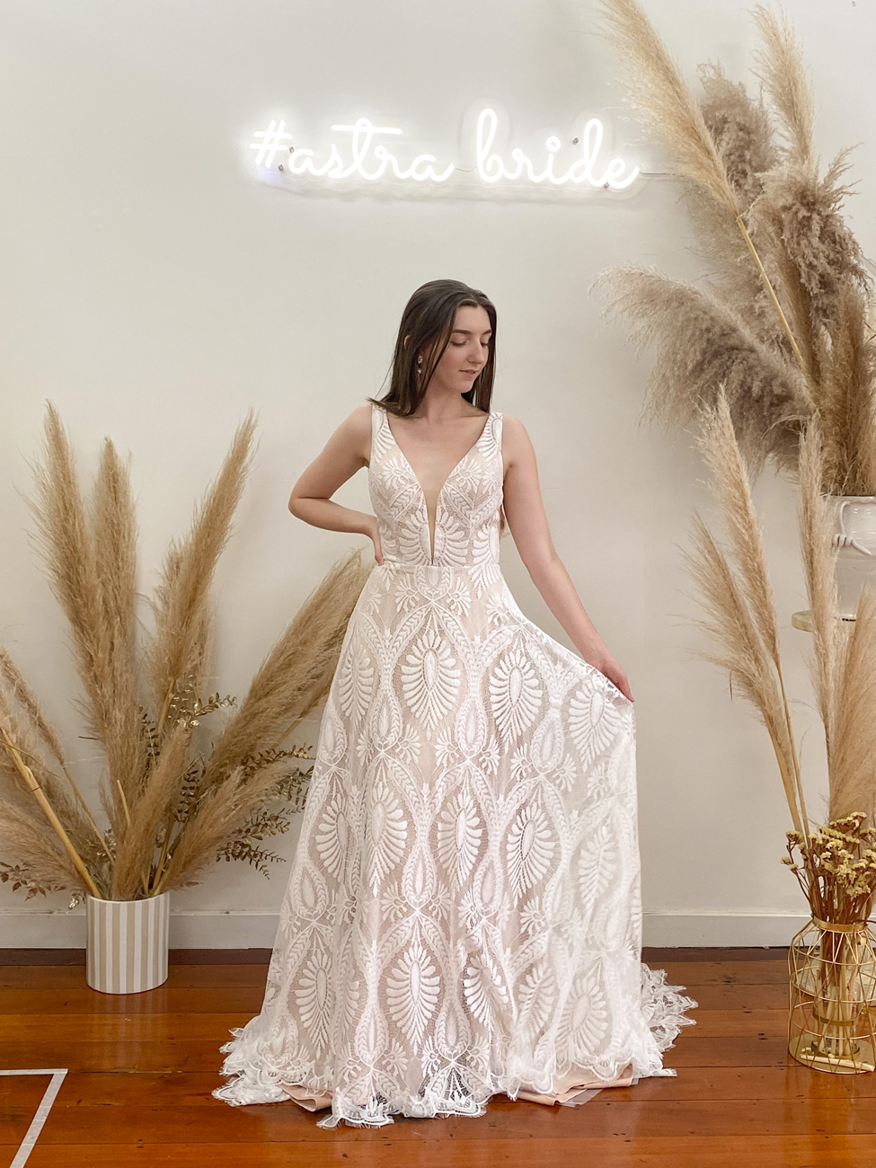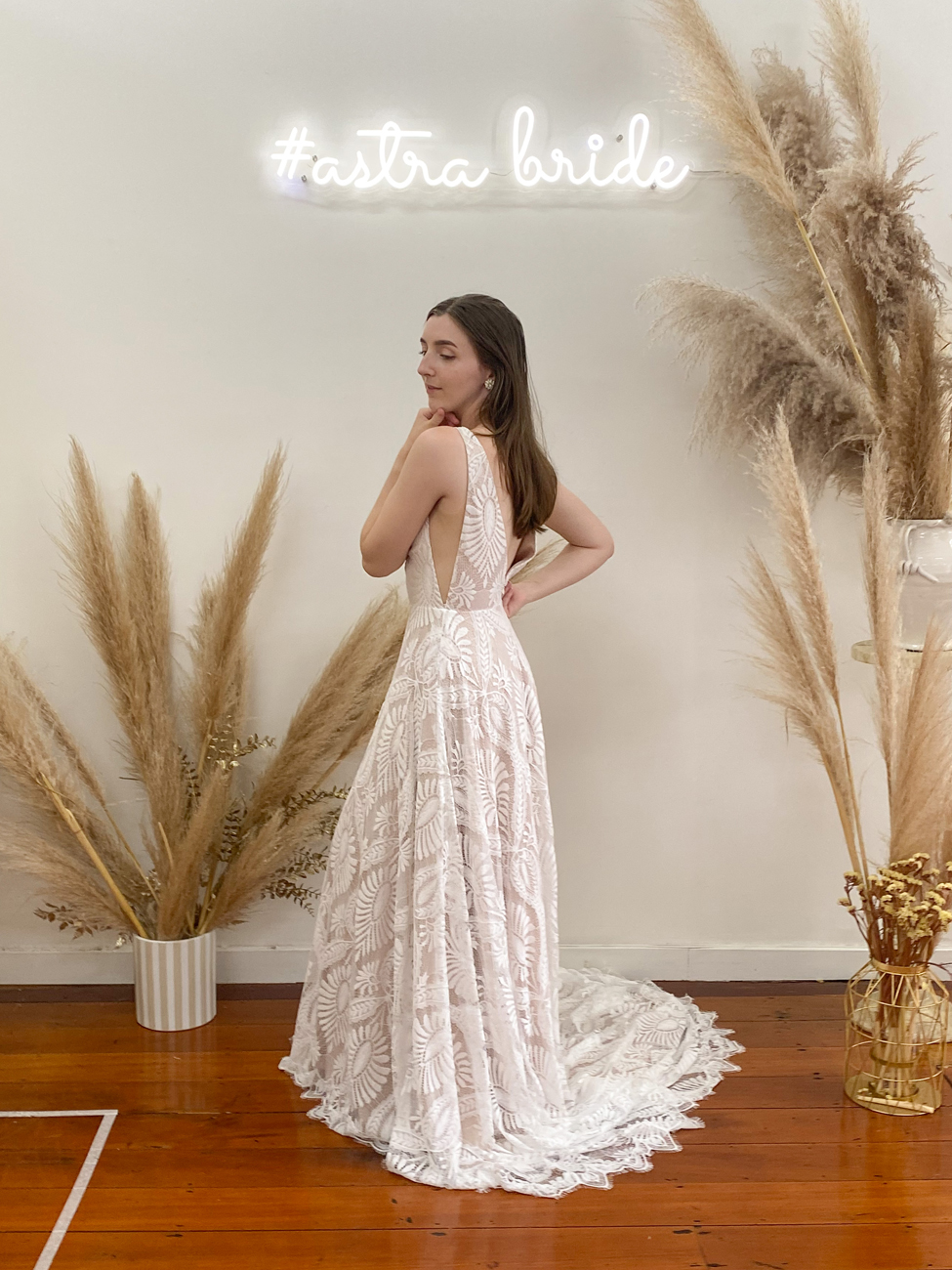 To determine if this gown will fit you, measure your bust, waist and hips (in Inches). See our easy guide on how to measure here