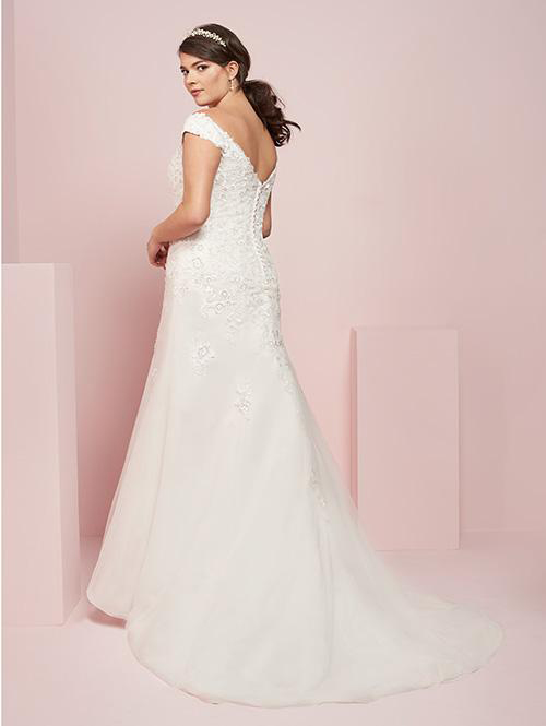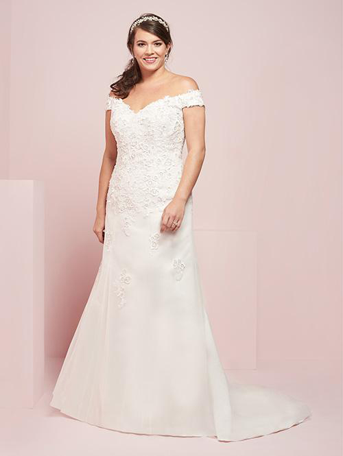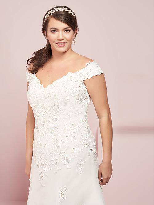 Off shoulder sweetheart neckline gown features laser cut 3-D floral sequin lace appliques and modified a-line fit.