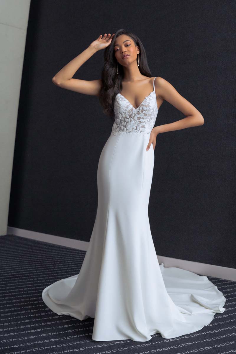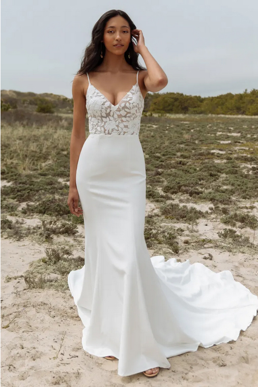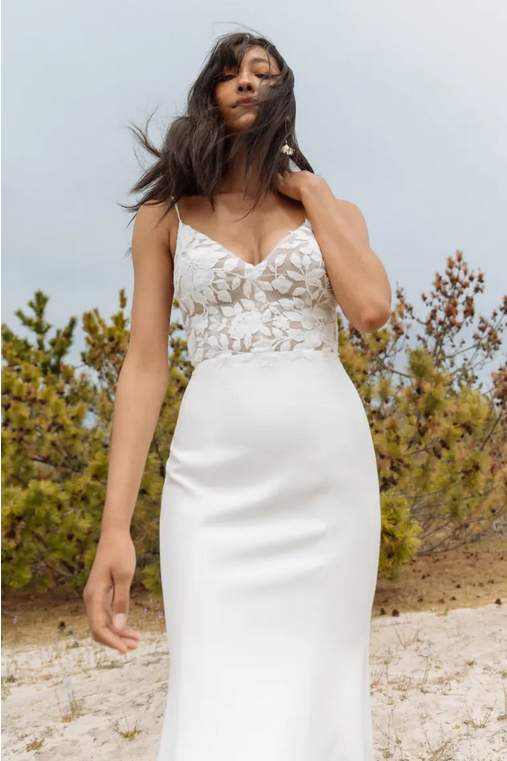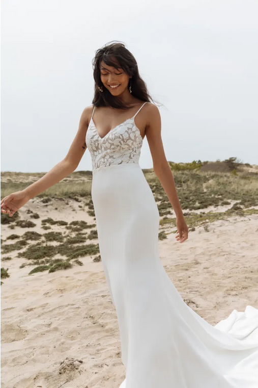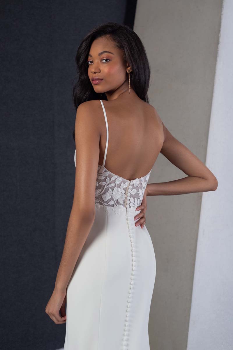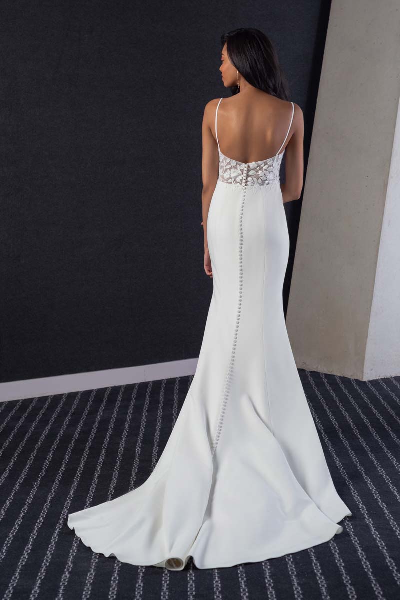 The Christina wedding dress takes a modern approach to romance. Featuring a sleek crepe fit and flare skirt, with a delicately textured sheer illusion floral bodice. Dainty spaghetti straps highlight your shoulders as the V neck and princess seams elongate your body in a clean, effortless way. A dramatic train and covered buttons to them give this gown a timeless feel.
