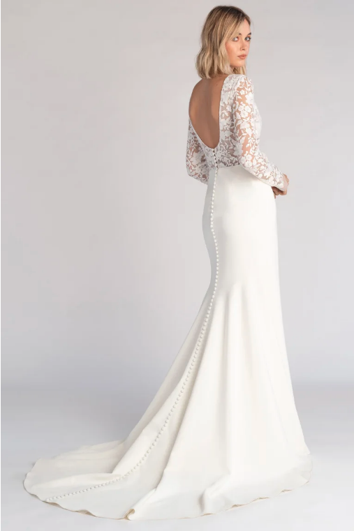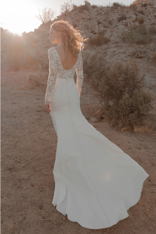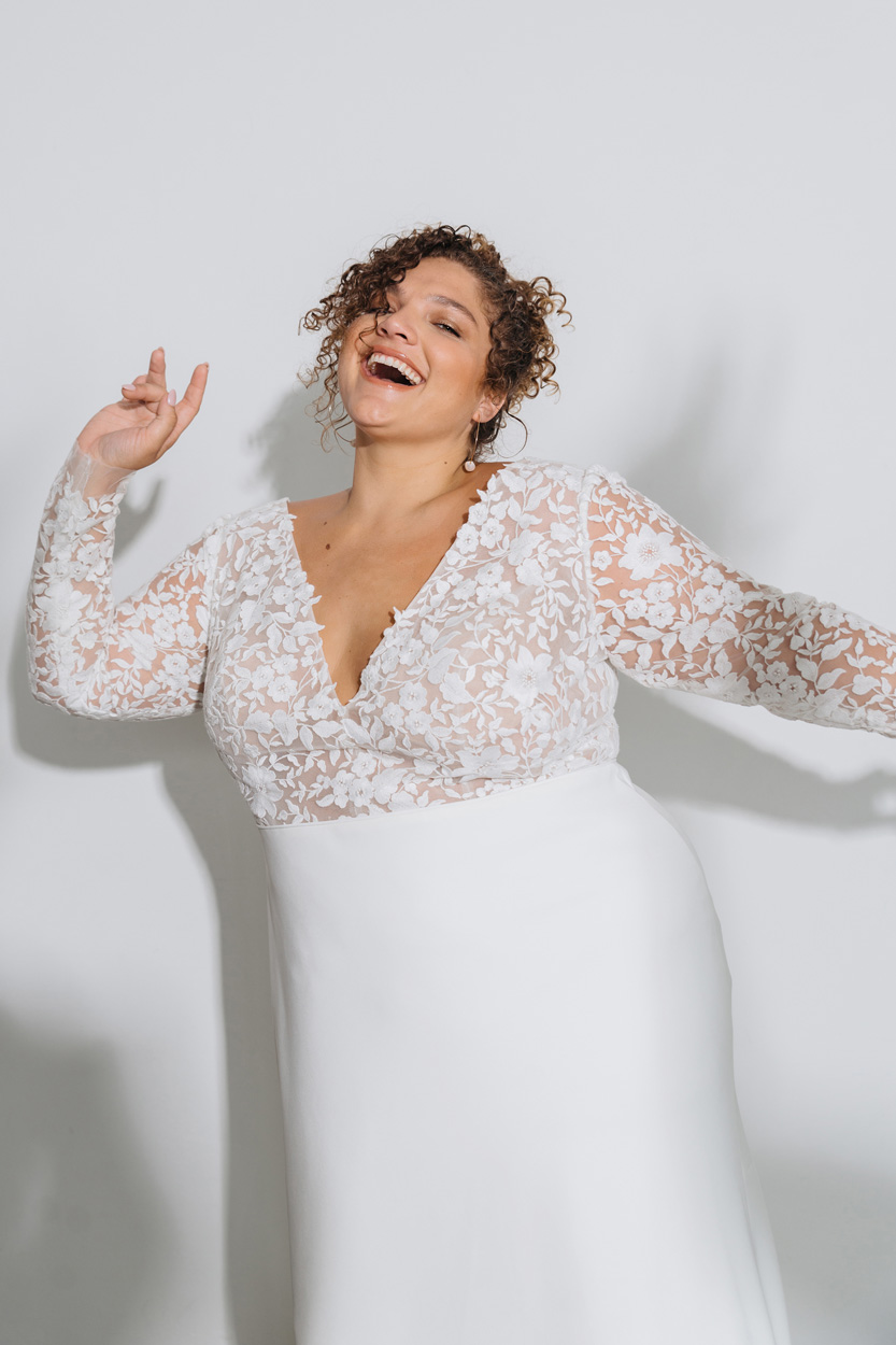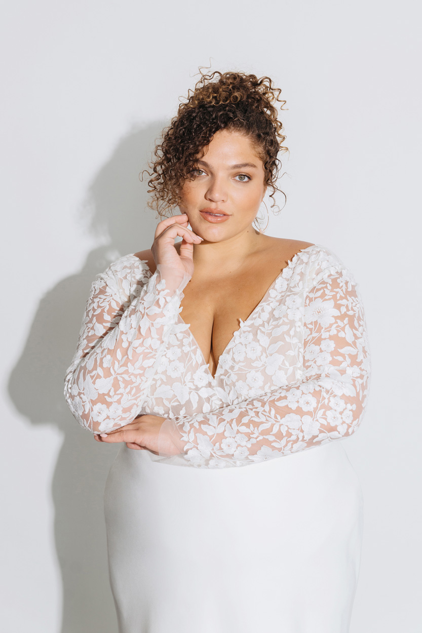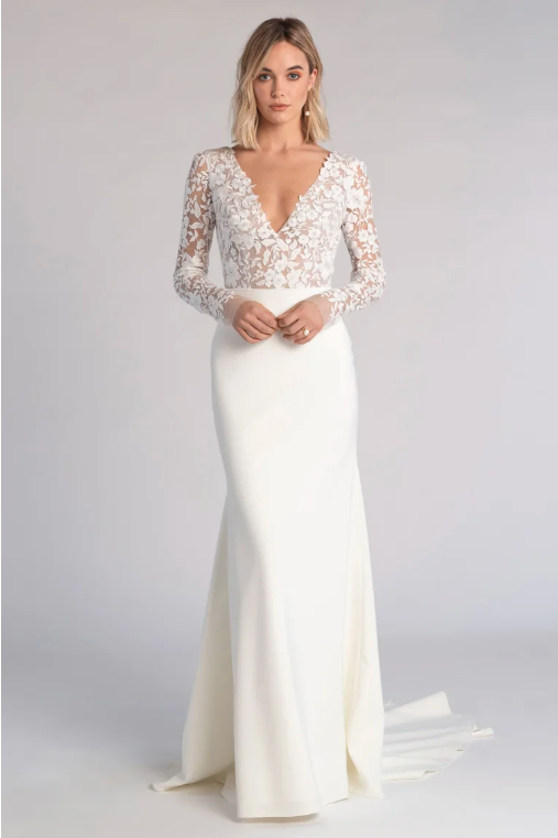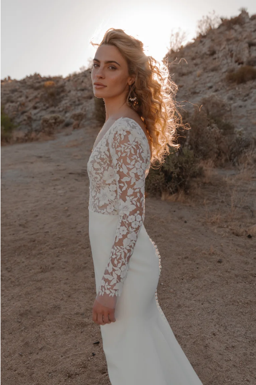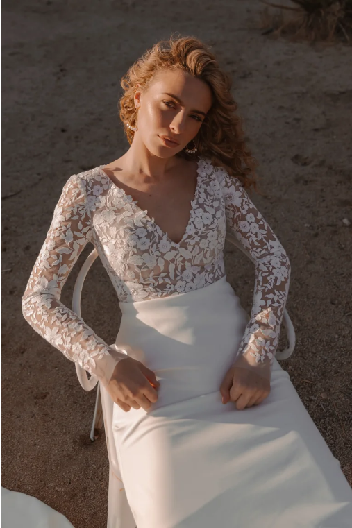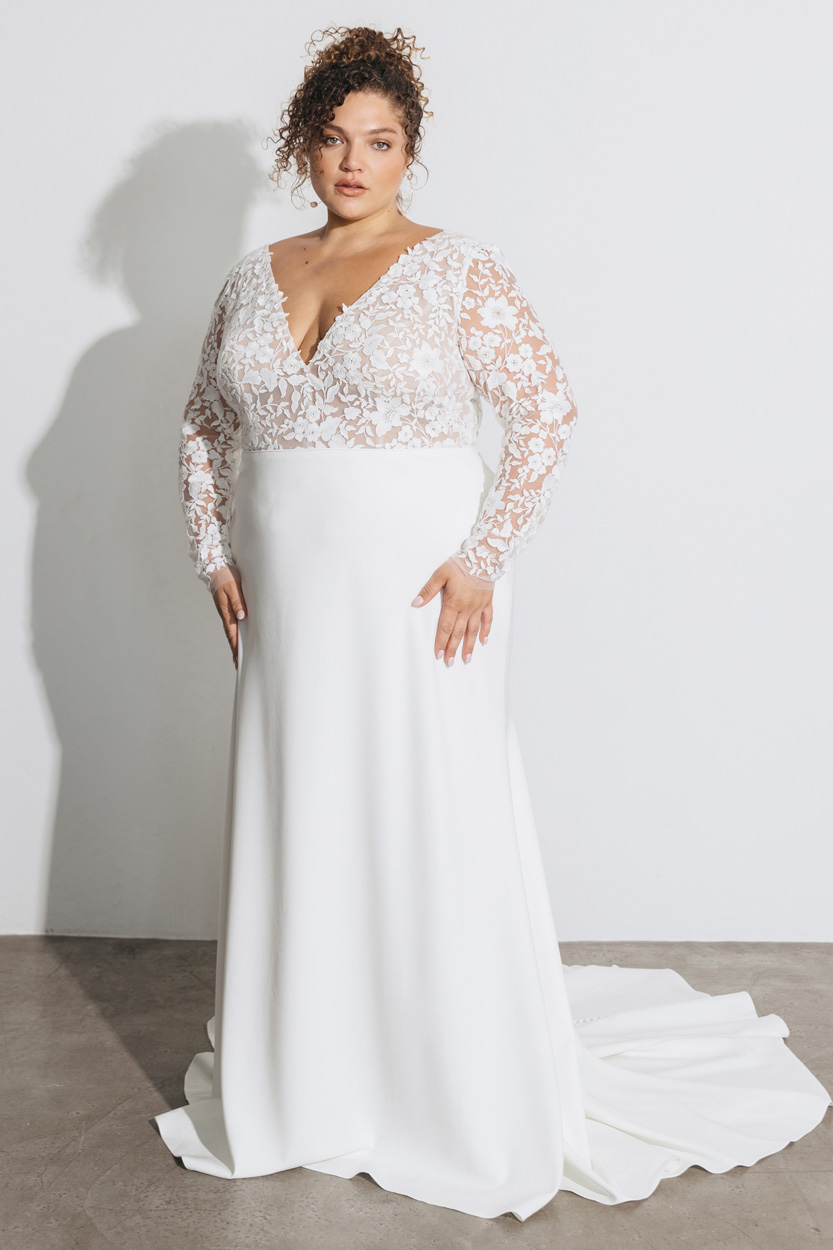 The Julian long sleeve V-neck wedding dress makes a timeless statement.