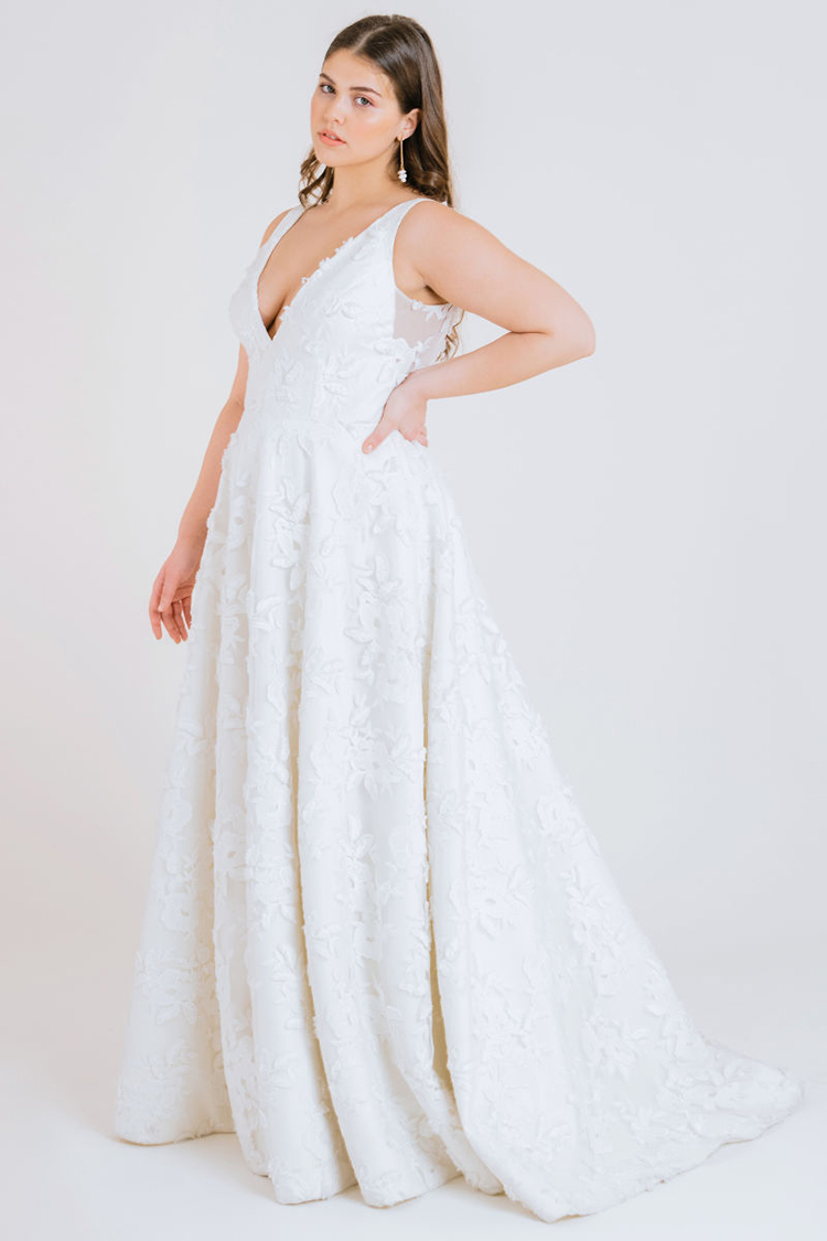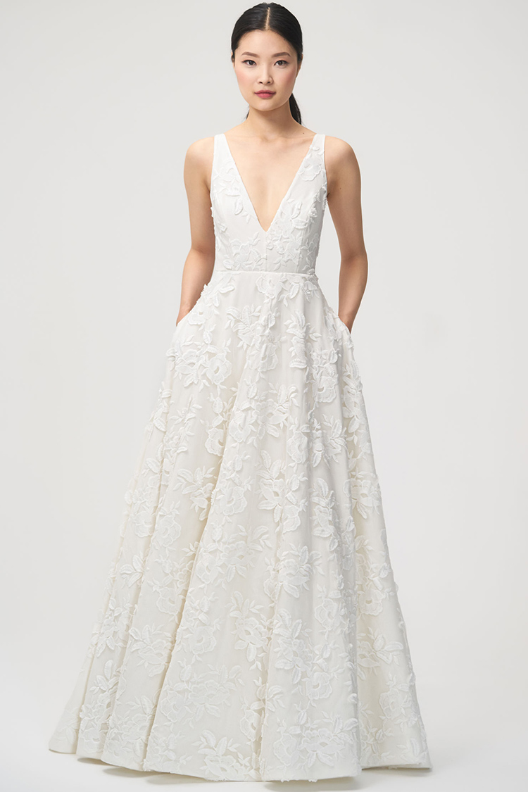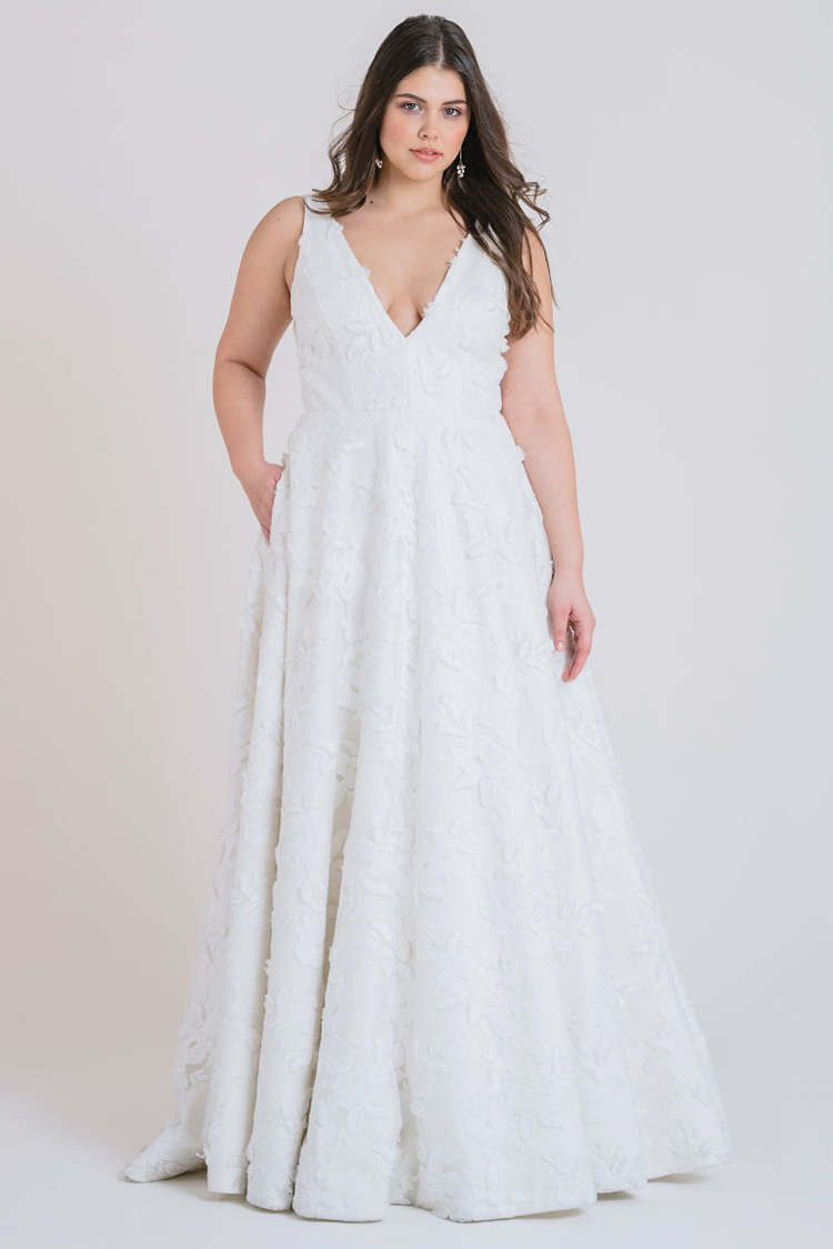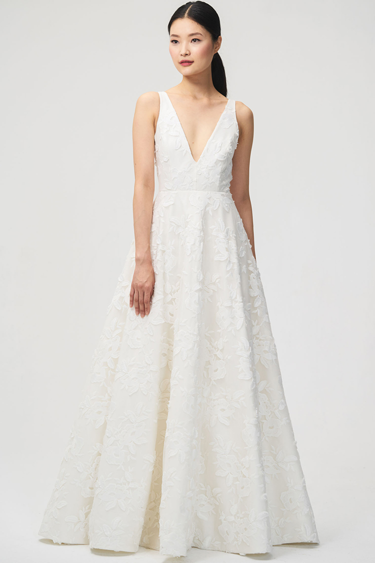 The Lela gown from Jenny by Jenny Yoo features 3-dimensional floral embroidery providing beautiful texture. A plunging V neck elongates the neck and brings attention to the smallest part of the waist. The circle skirt creates a flattering silhouette and flows down into a sweep train that completes the dramatic, romantic feel. This gown is fully lined with a center back zipper and button closure.