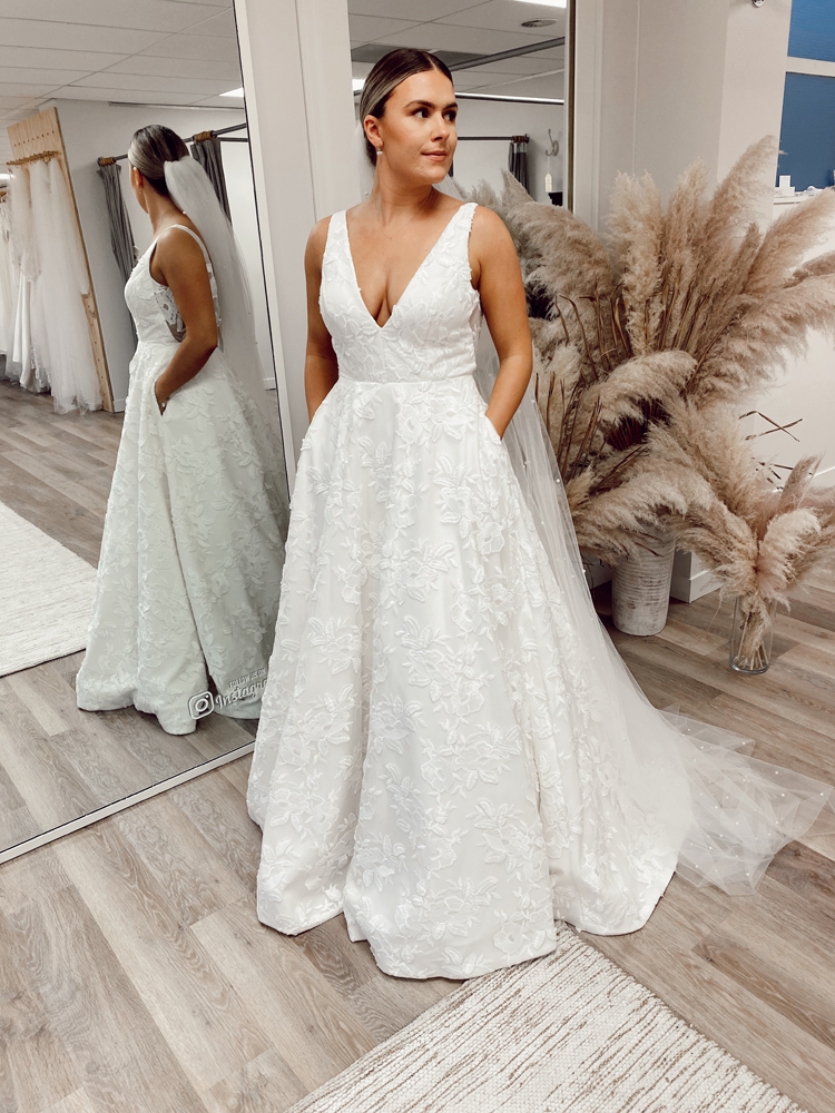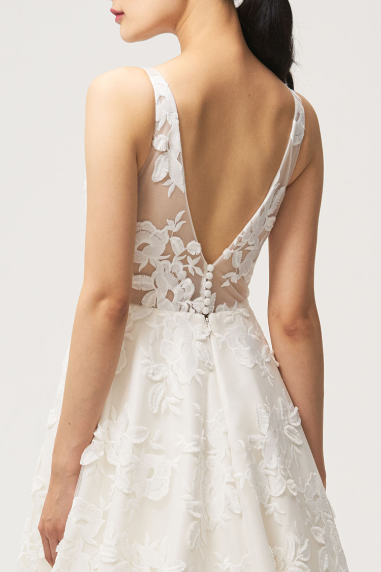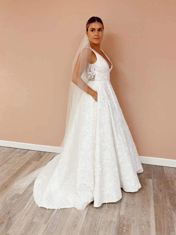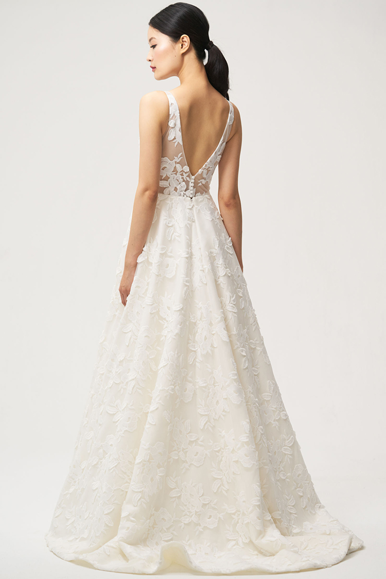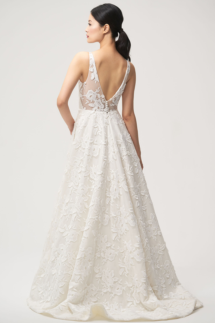 The Lela gown from Jenny by Jenny Yoo features 3-dimensional floral embroidery providing beautiful texture. A plunging V neck elongates the neck and brings attention to the smallest part of the waist. The circle skirt creates a flattering silhouette and flows down into a sweep train that completes the dramatic, romantic feel. This gown is fully lined with a center back zipper and button closure.
