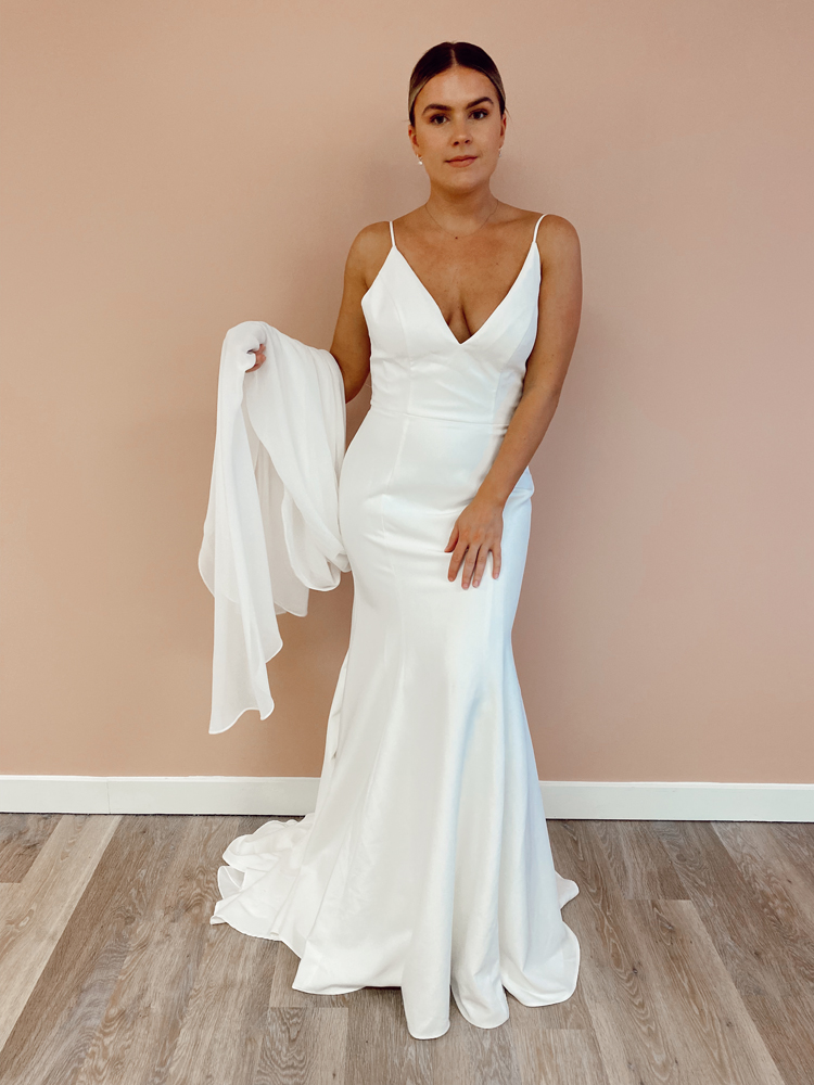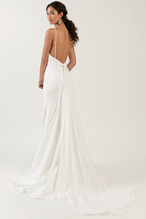The Marley Gown from Jenny by Jenny Yoo is a modern fit and flare silhouette in our supple Matte Crepe. The simple, chic spaghetti strap V neckline takes a turn towards the romantic with an open back and soft Chiffon knot detail that cascades into a flowy train. This dreamy wedding dress is fully lined with a center back invisible zipper.