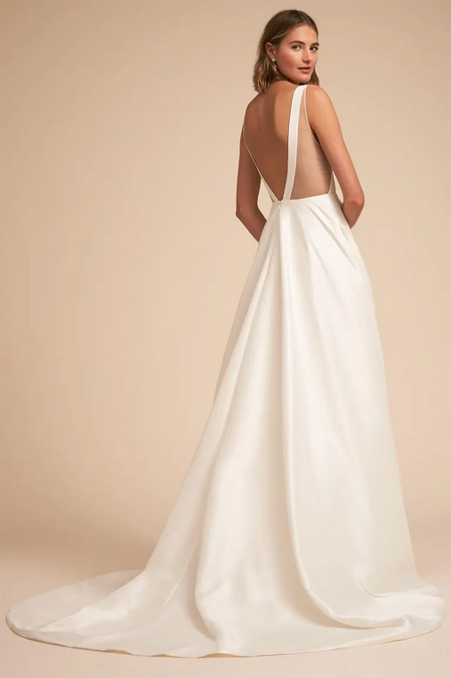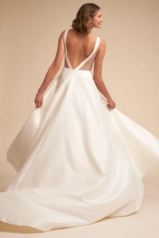 This tafetta gown features a deep V neckline and a strappy open back accented with angular illusion panels. The full A line skirt extends into a sweeping train.