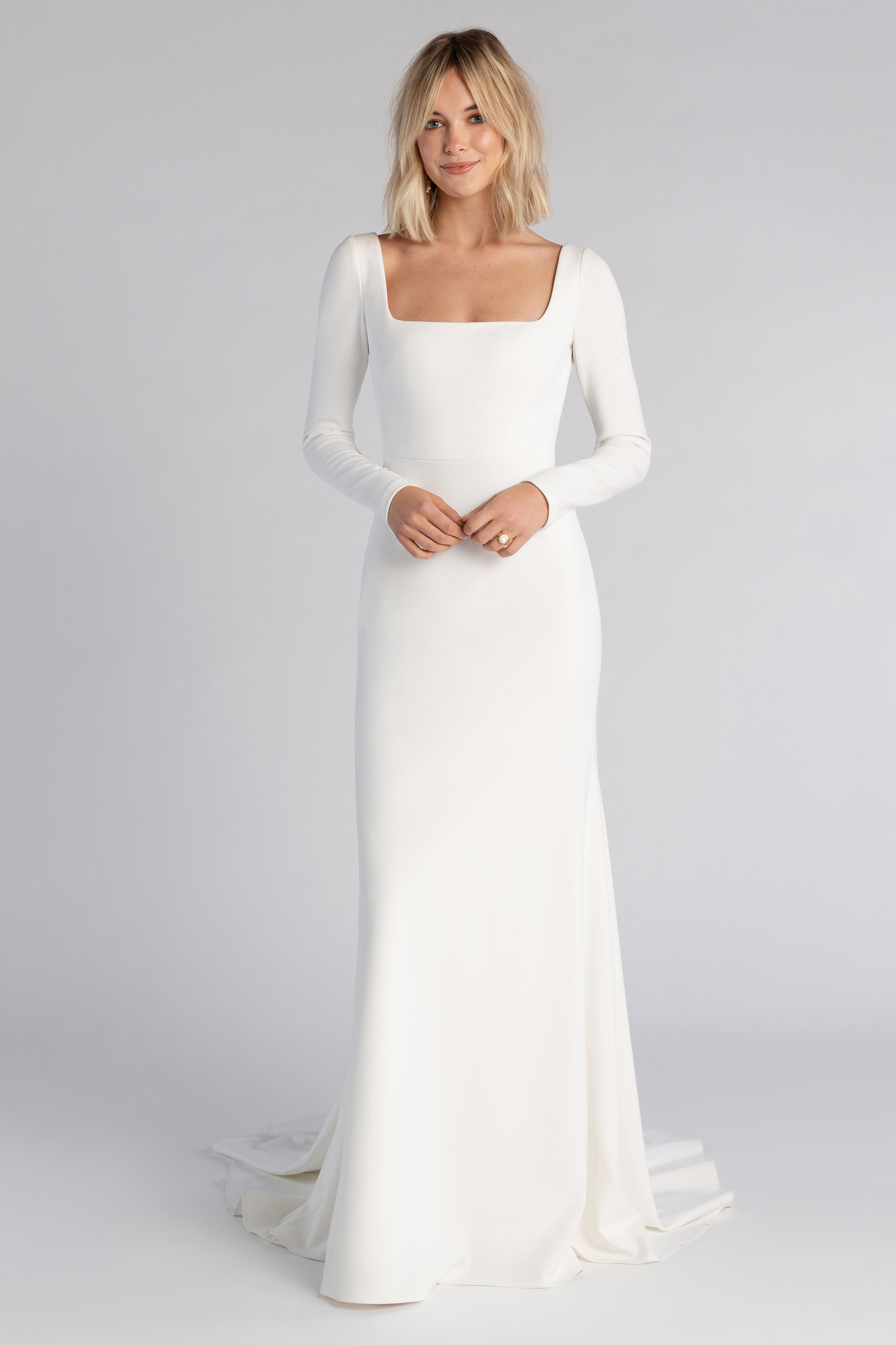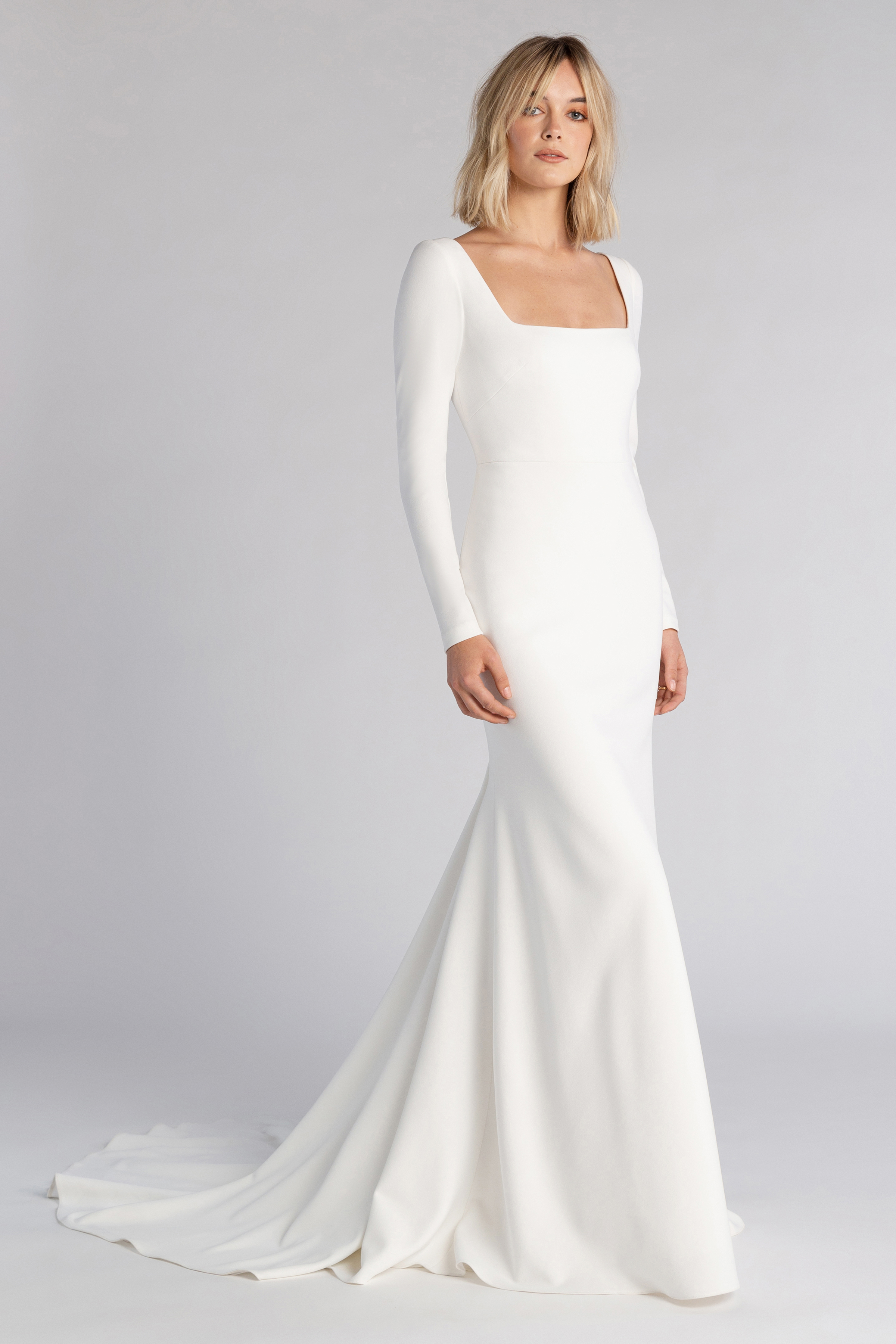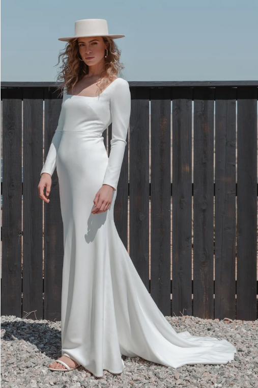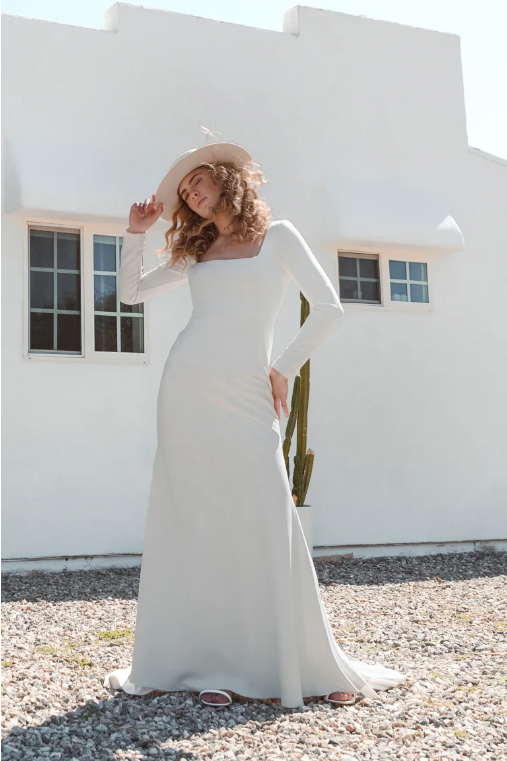 square neckline, fitted long sleeves, and a sleek fit and flare skirt.