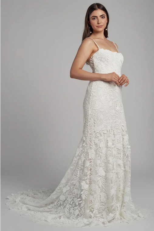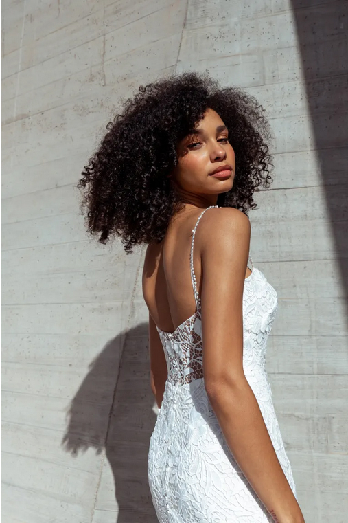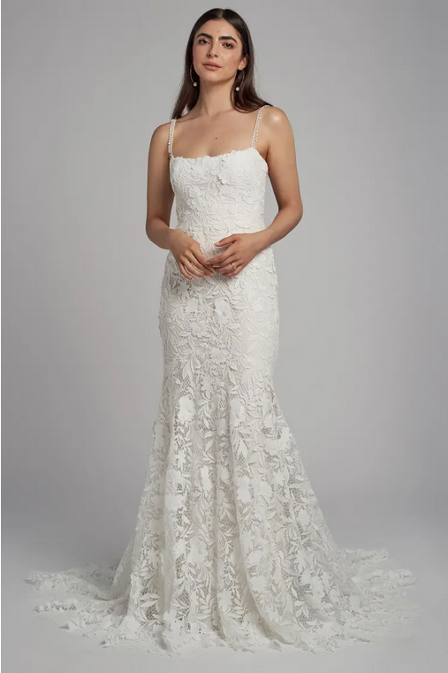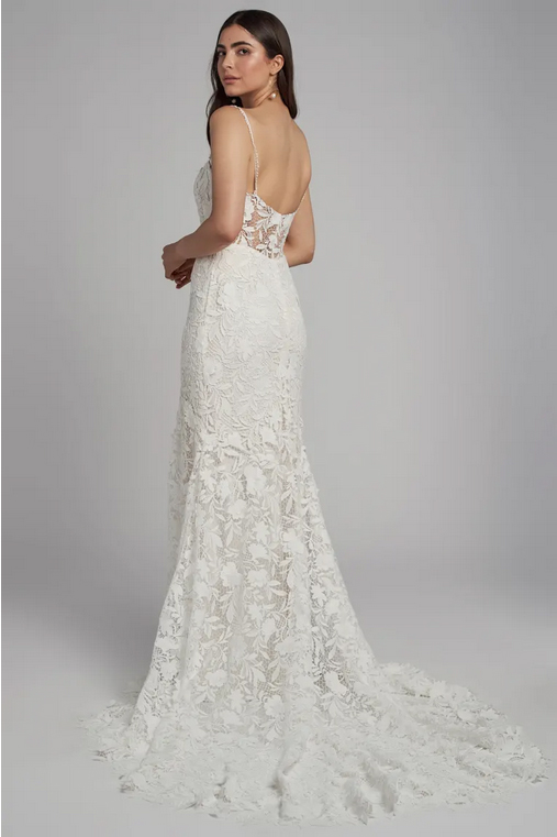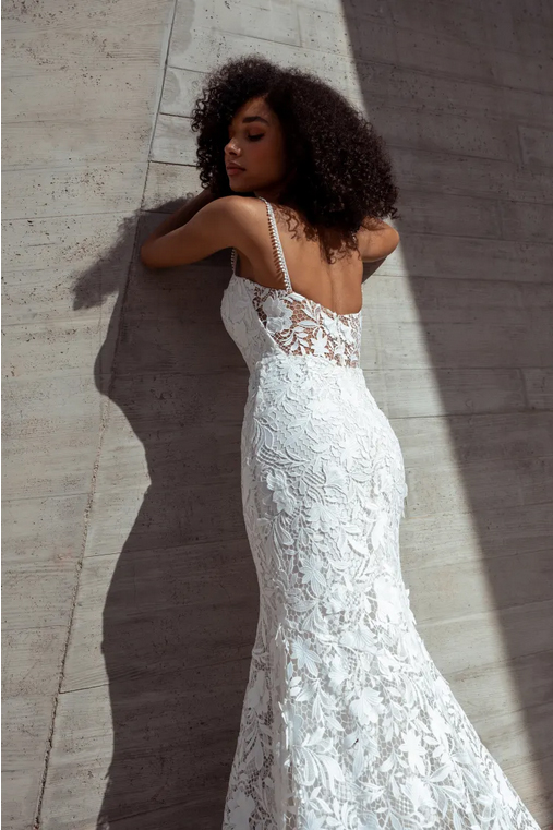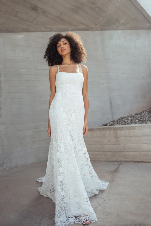 The Sydney lace wedding dress is cut in our intricately textured Cari floral chemical lace is striking in her simplicity. Dainty straps of complimentary trim lead into the straight neckline and sleek fit and flare silhouette. A hidden flounce seam lends beautiful sweep and movement, and the sheer illusion back lends just a peek of skin.