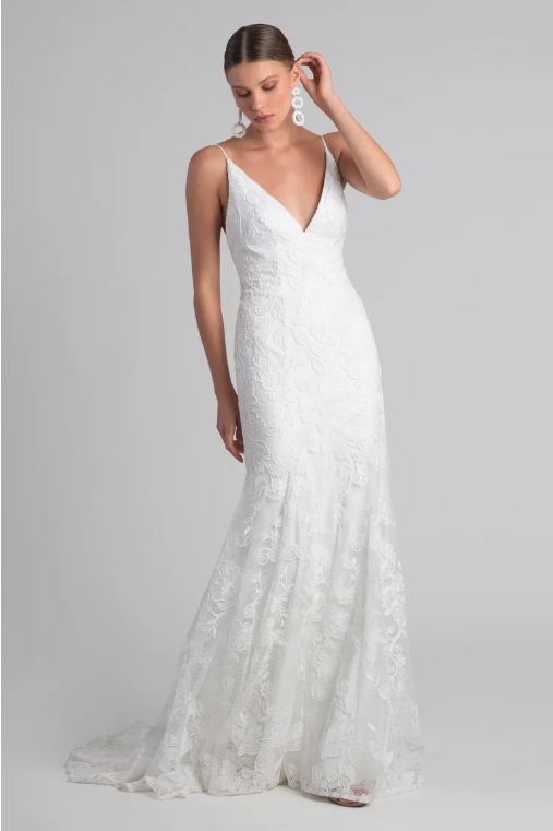 The Tensley lace V-neck spaghetti strap fit and flare bridal gown is as effortless as she is romantic. Gorgeous floral embroidered tulle gives this gown a bold yet delicate texture. The V-neck tapers up into delicate spaghetti straps that flatter your shoulders and collarbone, and all but disappear at the back for a barely there feeling. The sultry fit and flare silhouette releases into godets at the hem for dramatic fullness and movement. A back flounce seam gives way to a chapel length train left sheer to appreciate the detail of the floral embroidery