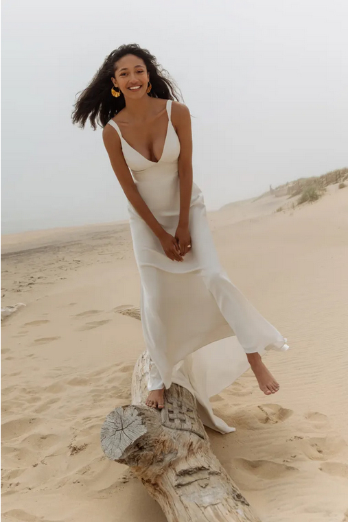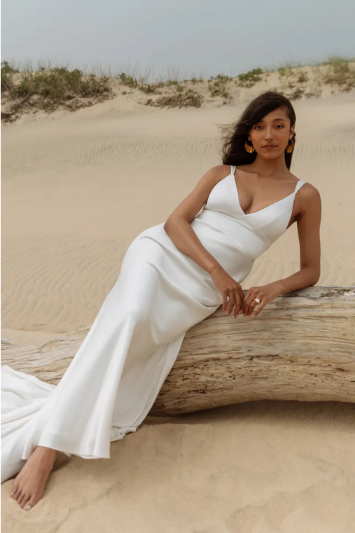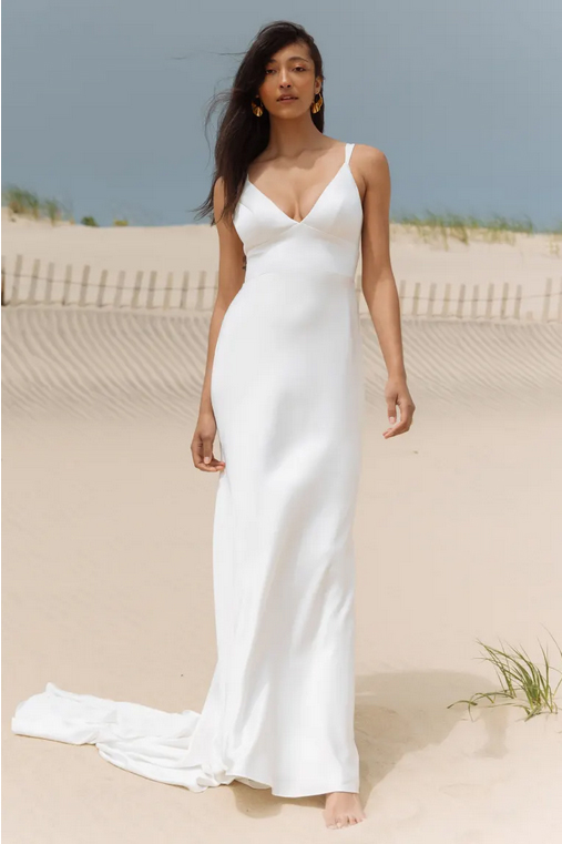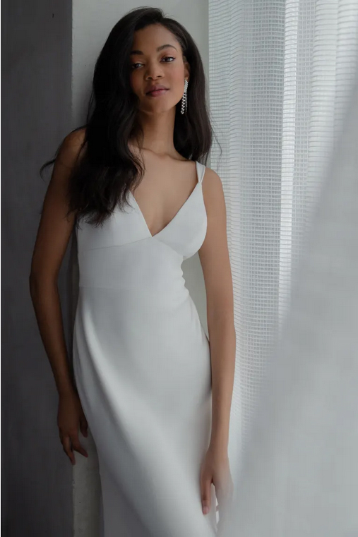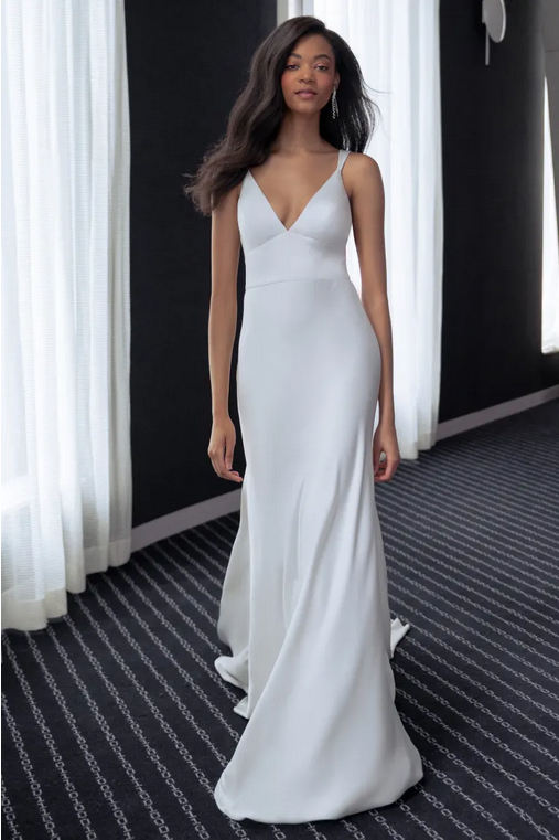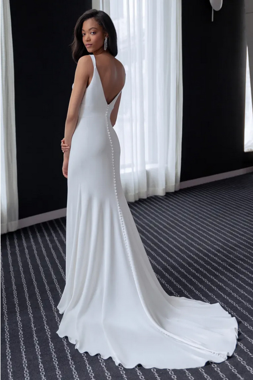 The Valerie satin wedding dress incorporates just a hint of a vintage feel for a truly timeless gown. The V neck and tapered straps highlight your décolletage and collarbone beautifully, while the pitched cummerbund waist lends support and nips in your waist. The slinky bias cut skirt slinks over your every curve, and a back flounce seam leads to a dramatic train. Covered buttons to the hem add one last classic detail