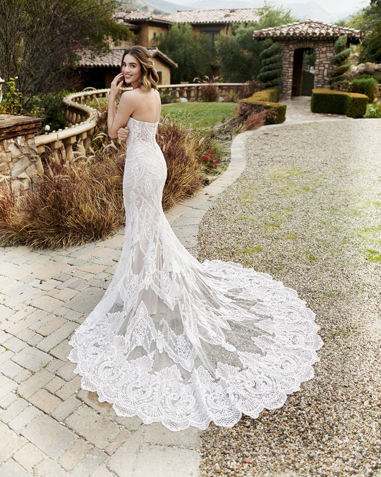 Incredible Kenneth Winston designed Boho strapless wedding gown in the most incredible lace. Classic Mermaid shape with amazing train.