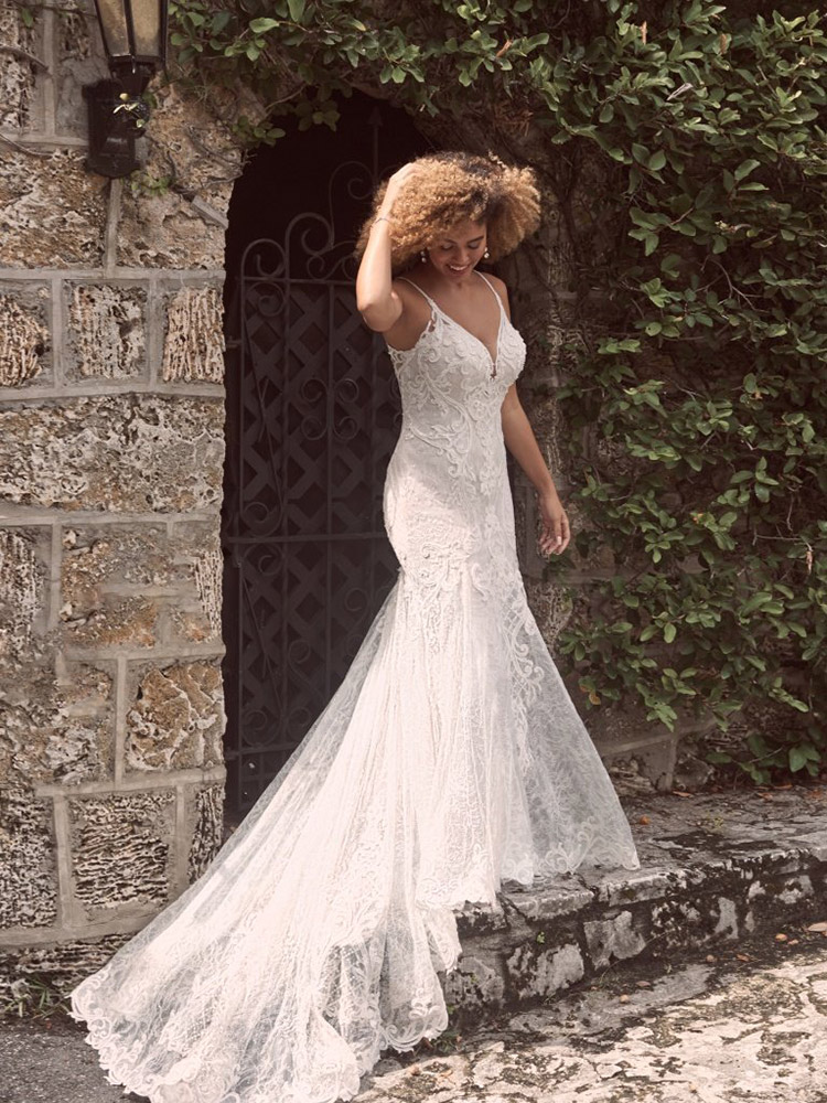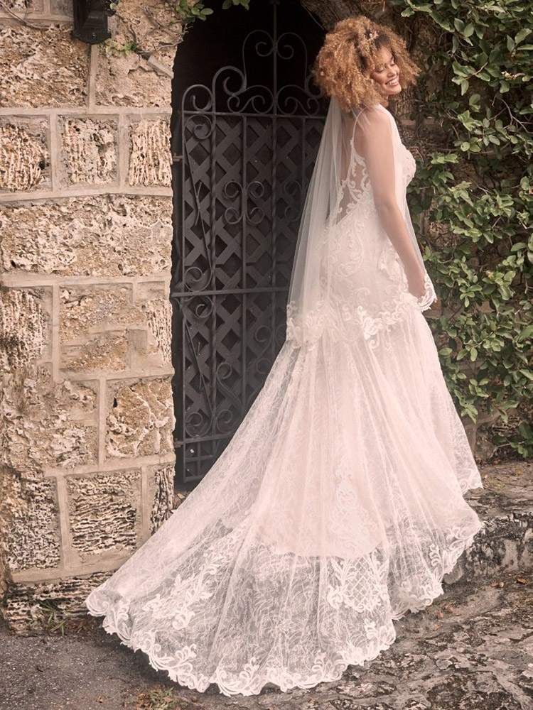 A resounding "Yes!" to shimmery texture, a sweetheart neckline, and an ultra-flattering silhouette in this sexy low-back mermaid wedding dress.