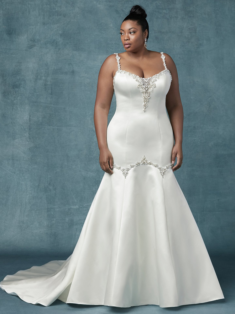 Jewelry need not be reserved to accessories only. Make shimmer and shine the main feature in this satin trumpet wedding dress embellished in Swarovski crystals and beaded trim.