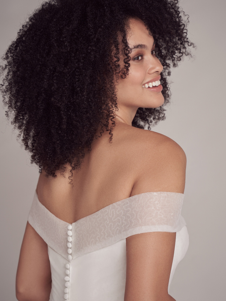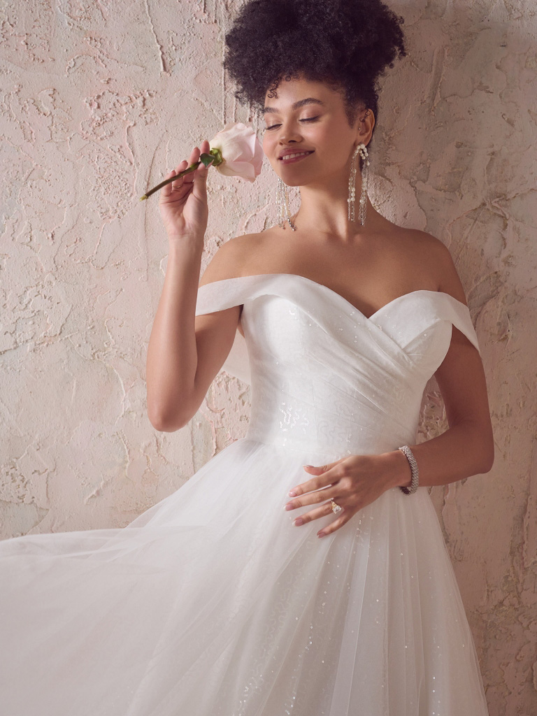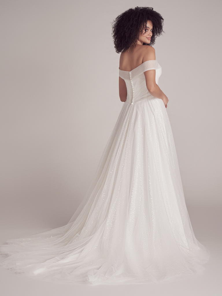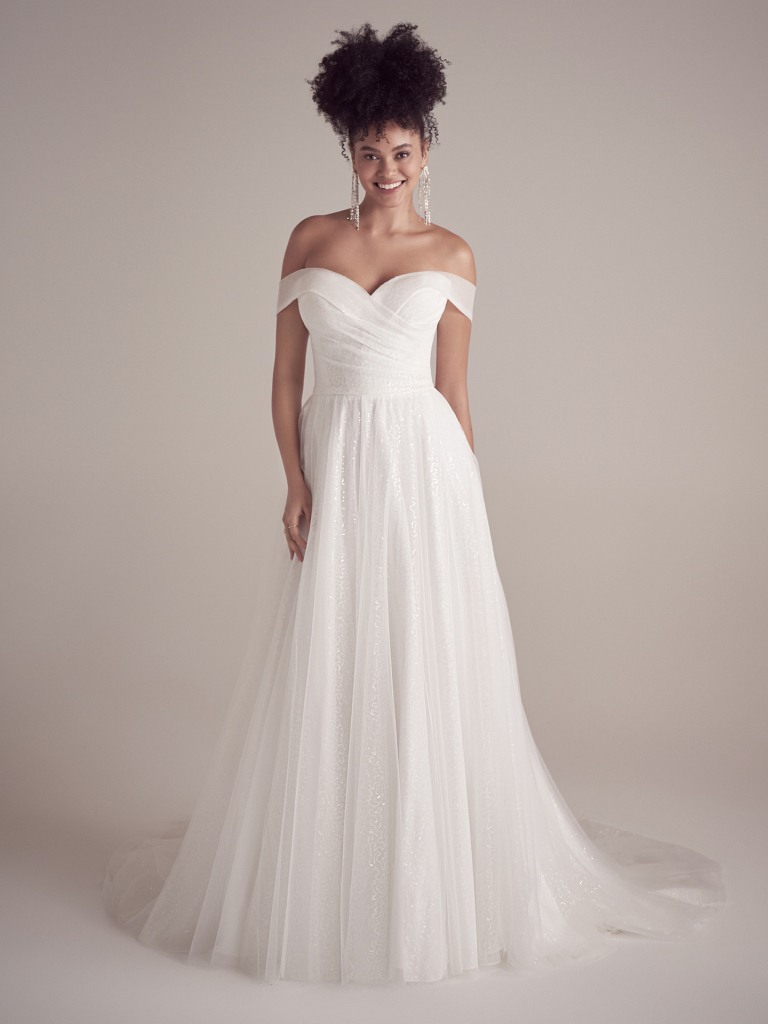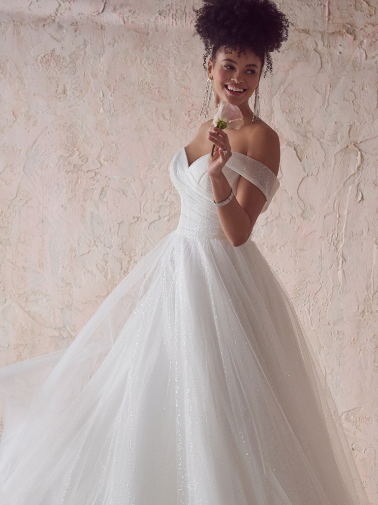 Off-the-shoulder shimmery wedding dress tulle skirt