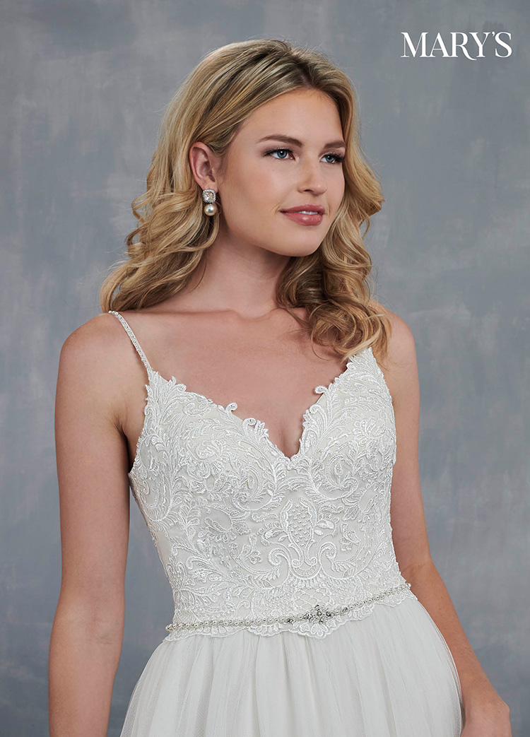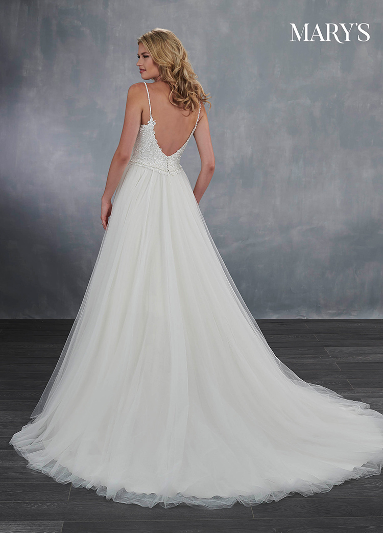 Fanciful natural waist wedding/bridal dress with a lace applique bodice, sweetheart neckline, and thin beaded spaghetti straps. The gown features a cutout back neckline, full tulle overlay skirt, covered buttons, and a chapel length train