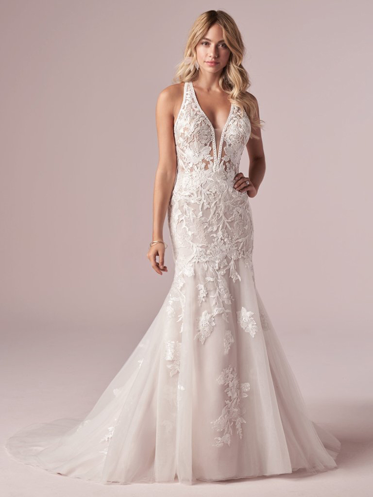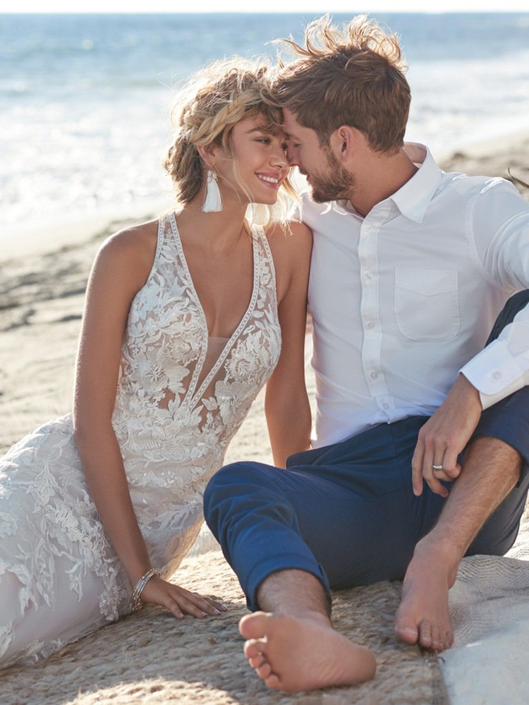 If you've got your heart set on boho, we can't help but steer you in the direction of gorgeous florals and a slinky-chic silhouette. For your consideration: this backless V-neck sheath wedding gown in nature-inspired perfection.