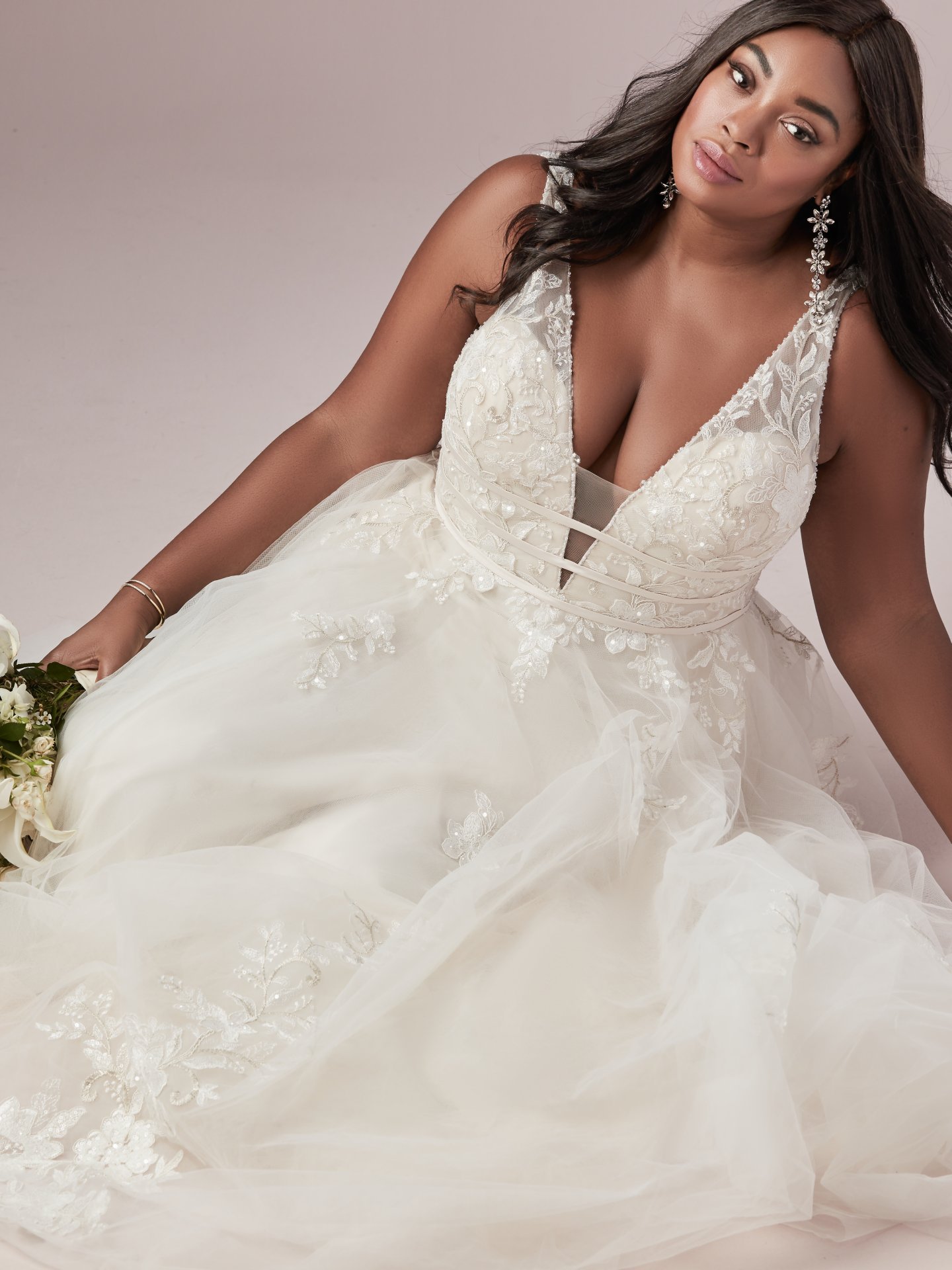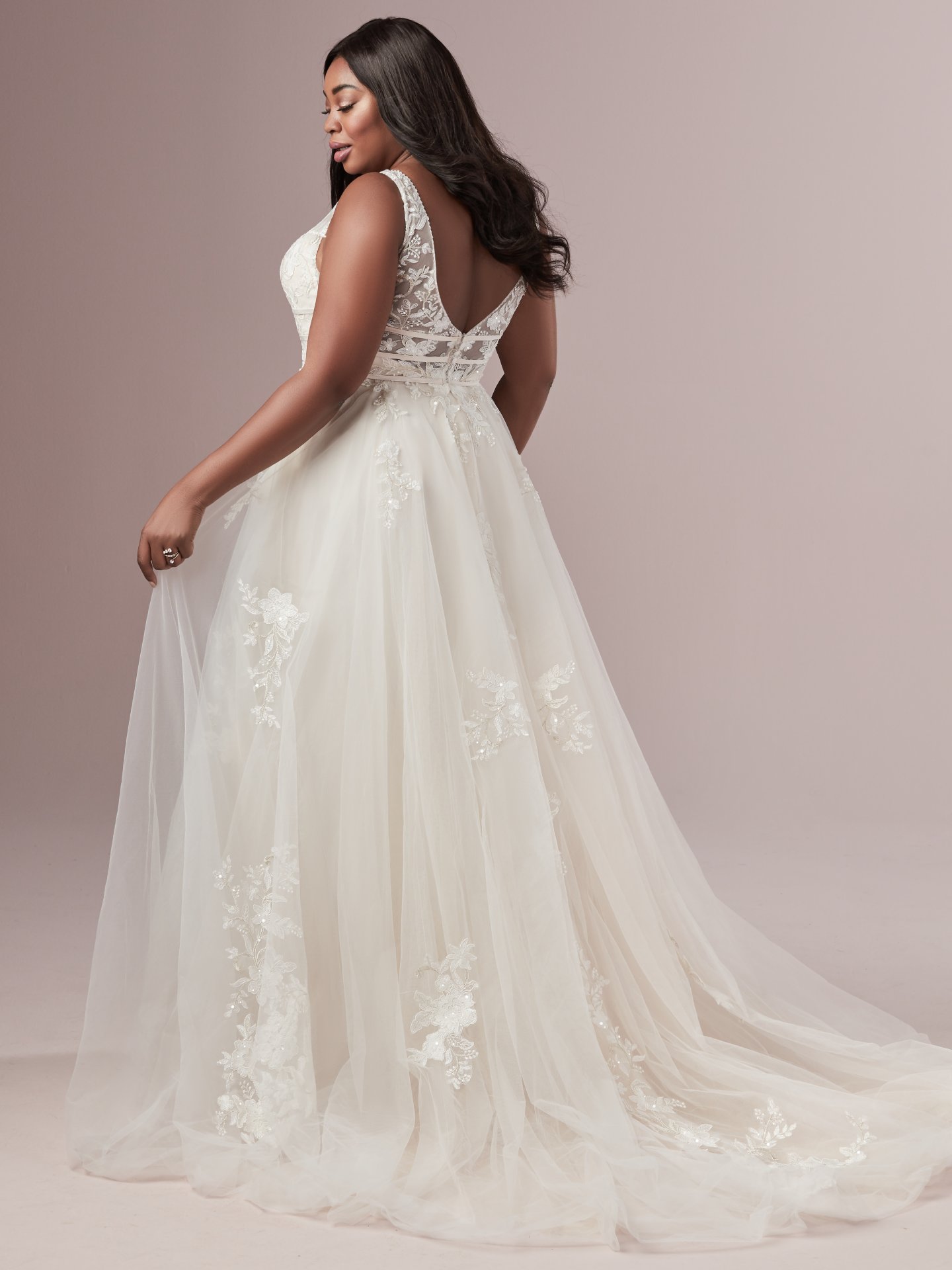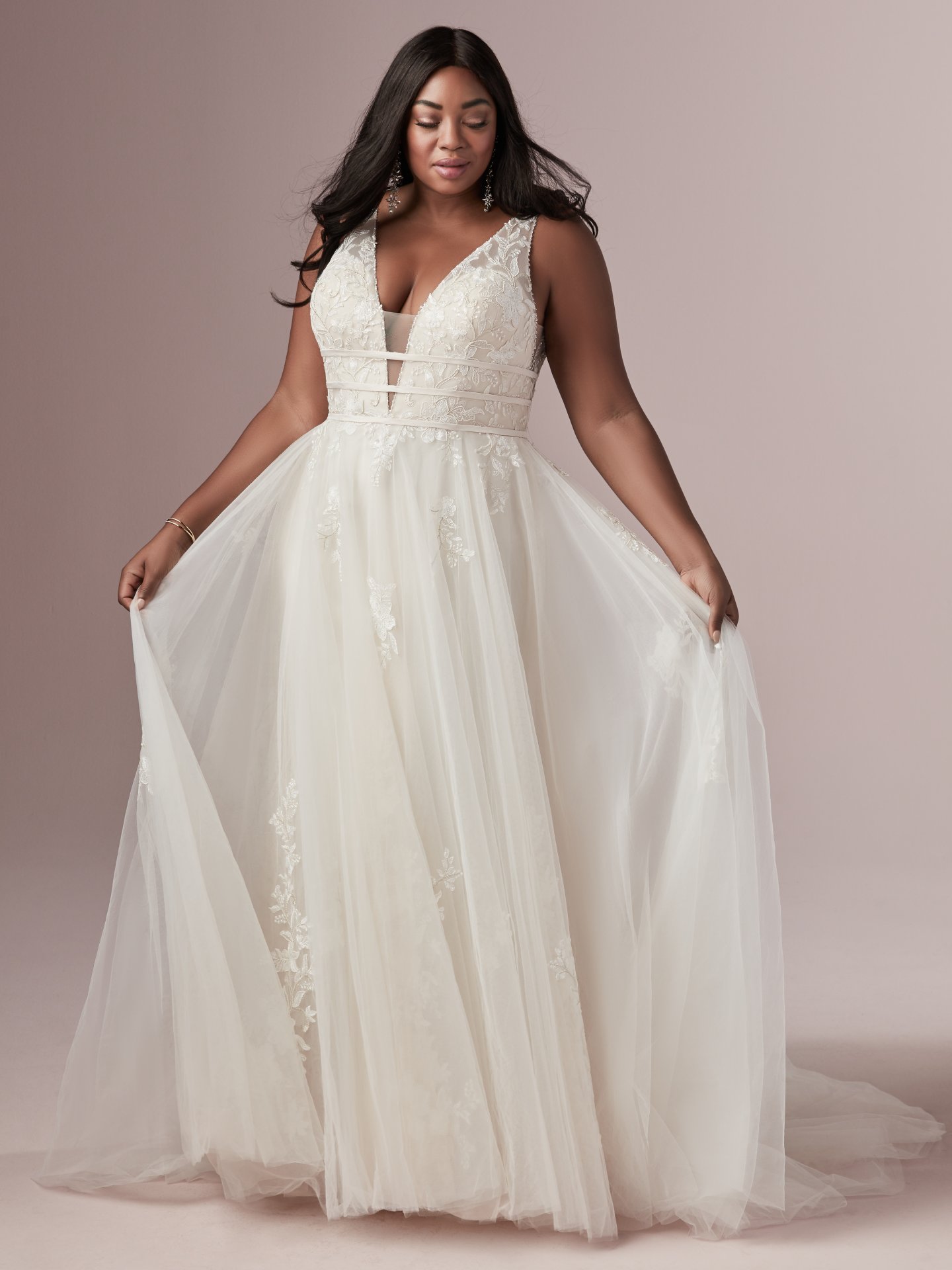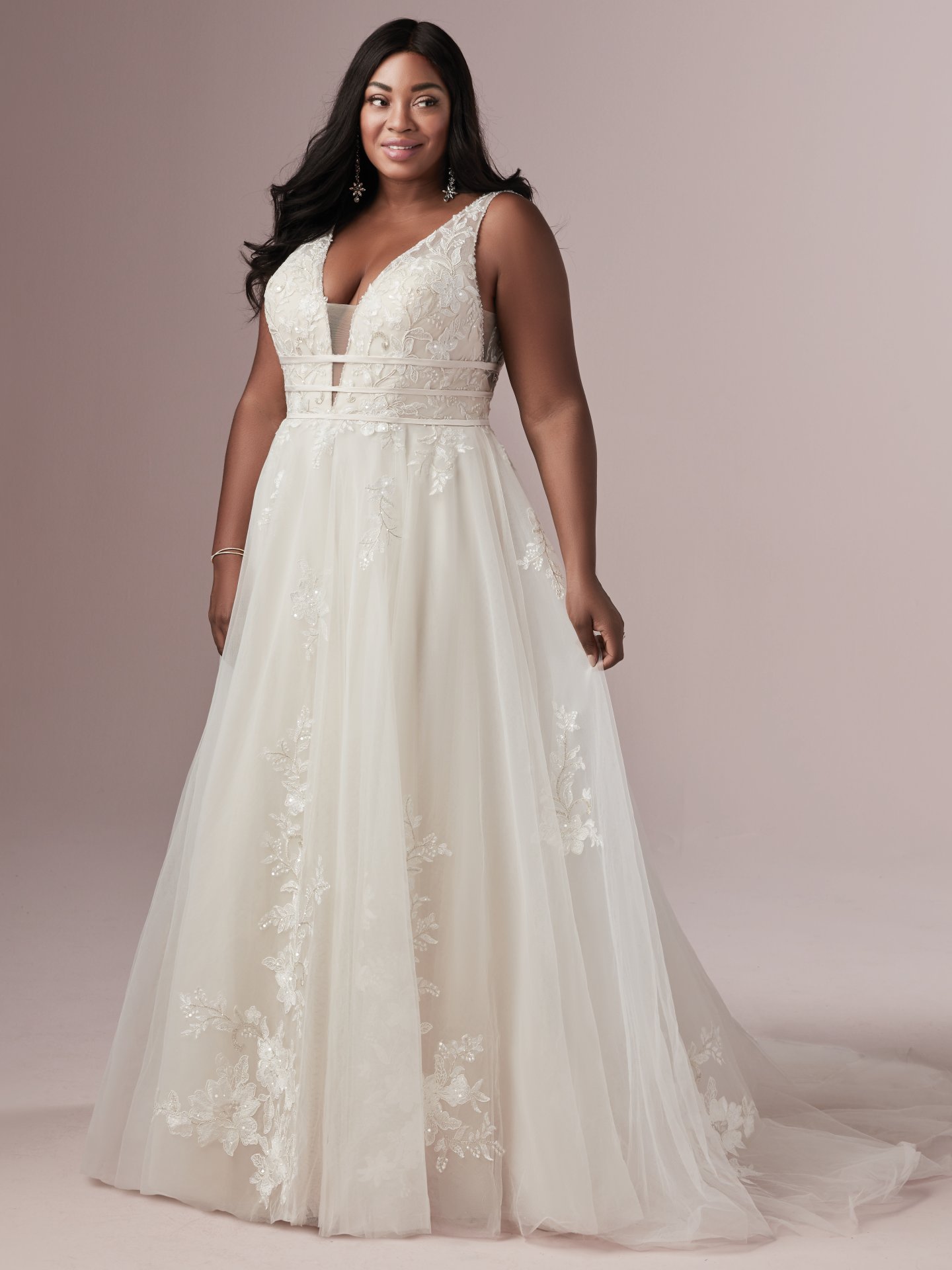 This exquisitely romantic A-line wedding dress offers additional coverage to our Raelynn style. Featuring three bands wrapping around a lined lace bodice accented with beading, lining a plunging illusion V-neckline and V-back. Complete with illusion lace straps and lace motifs adorning a tulle skirt. Finished with covered buttons over zipper closure.