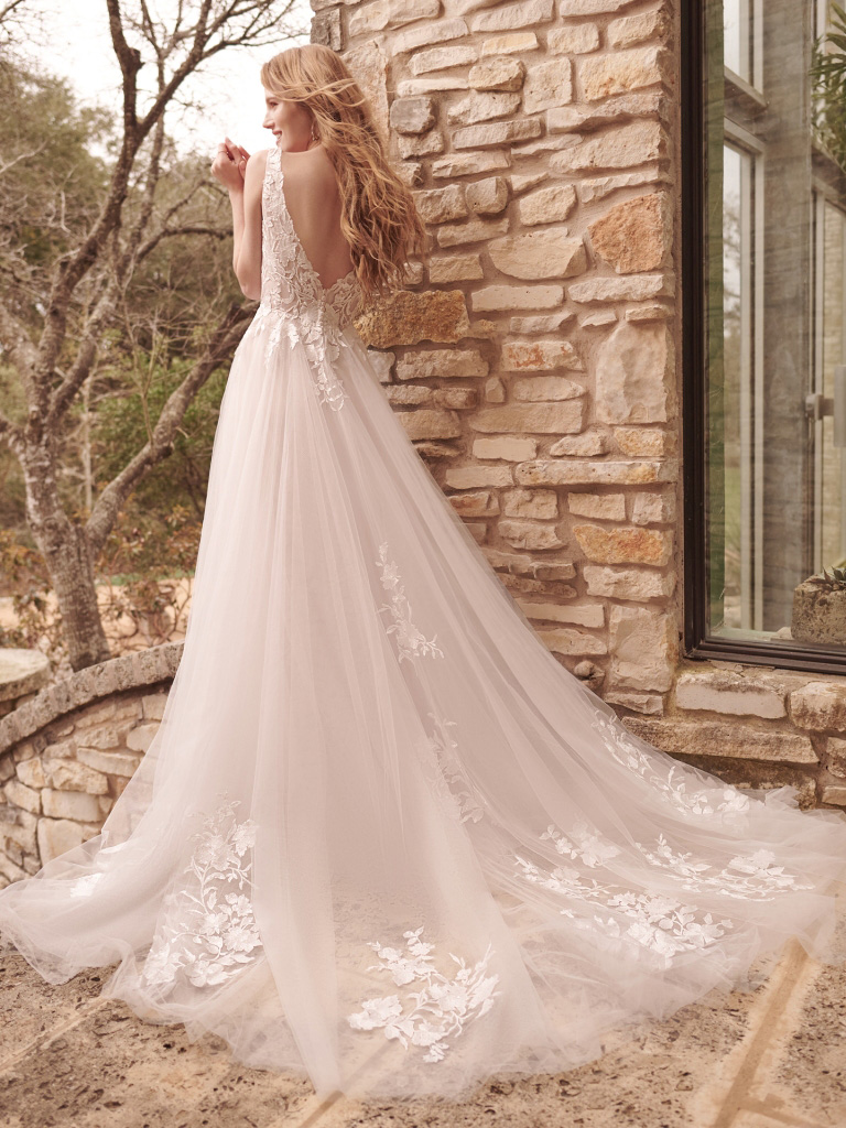 Sequined lace motifs over tulle, Sheer organza lined lace bodice
