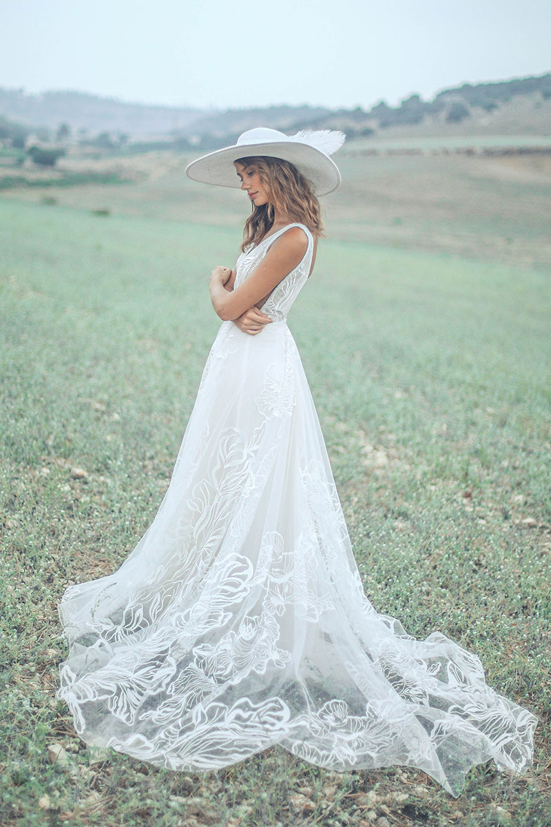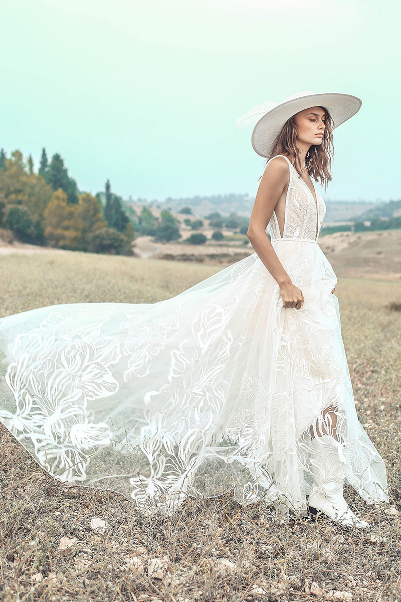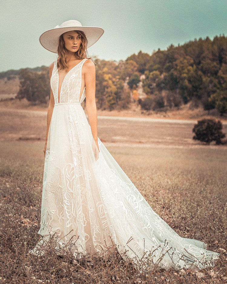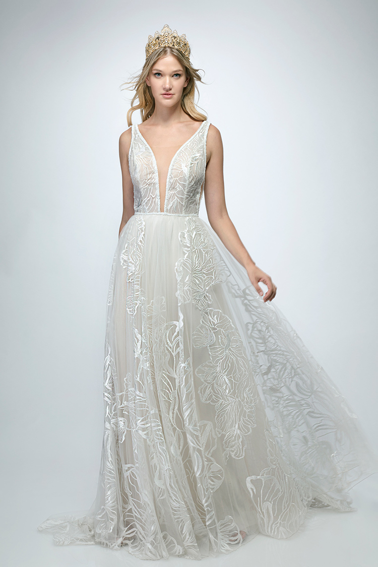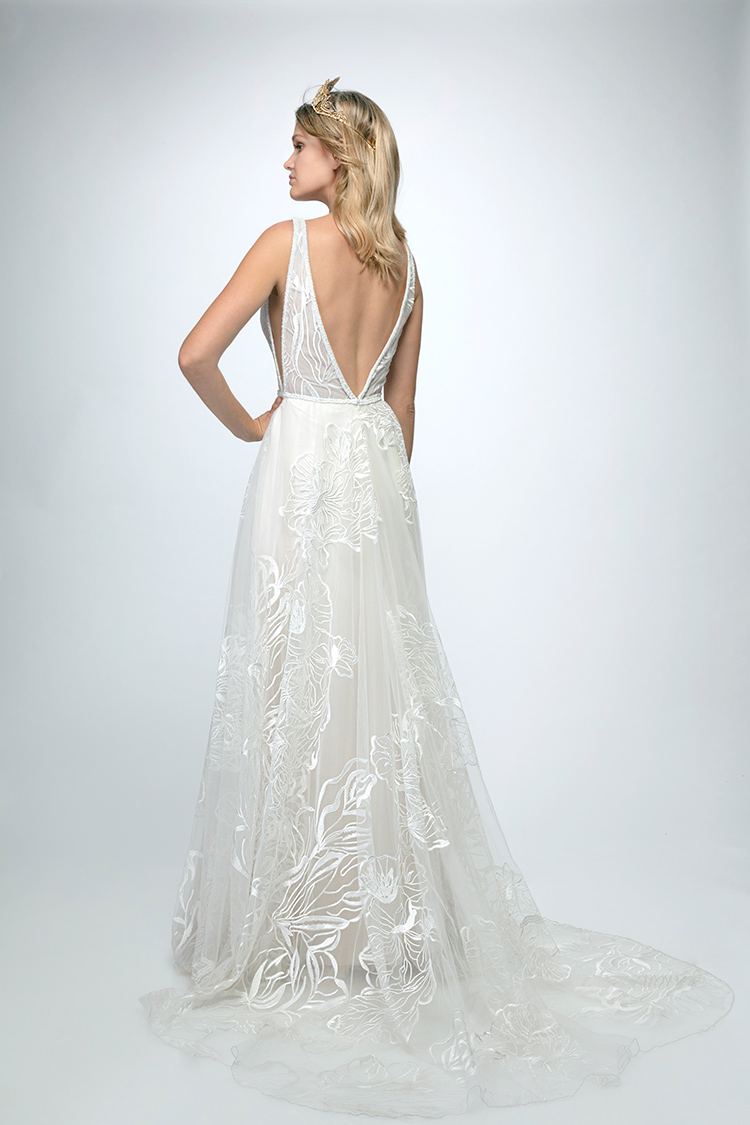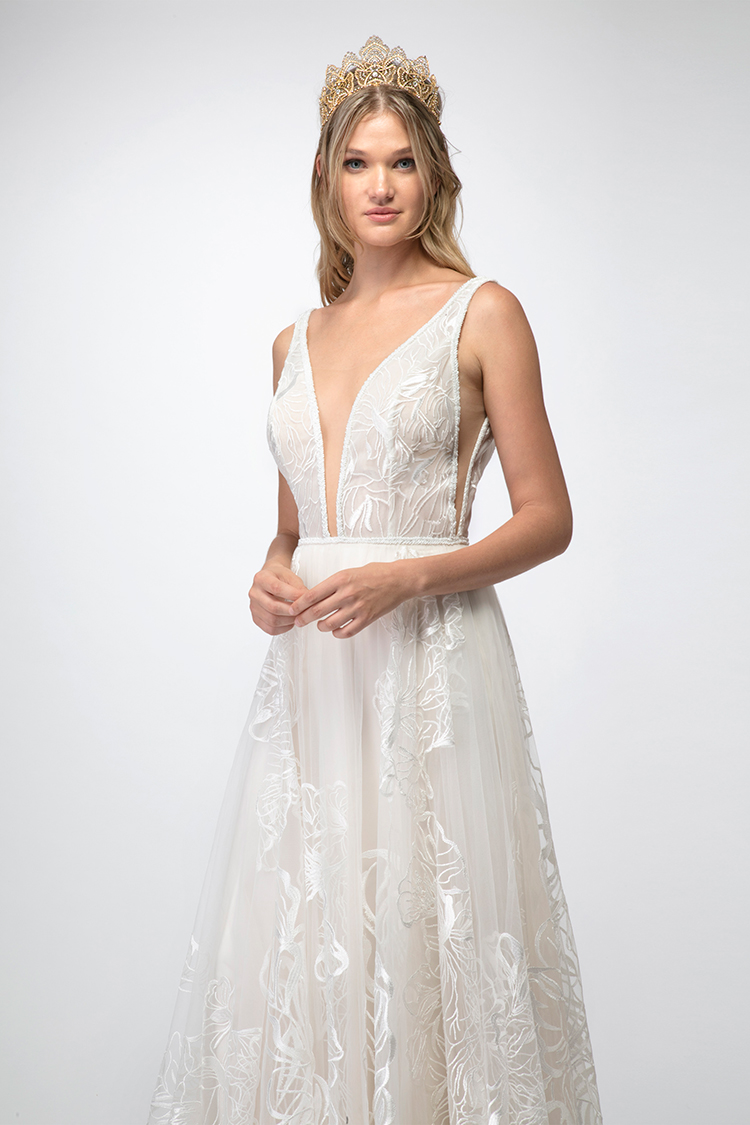 #CalandraByRish is a soft A-line gown with beautiful oversized floral lace, a plunging neckline, side cutouts, and a low V-shaped back.