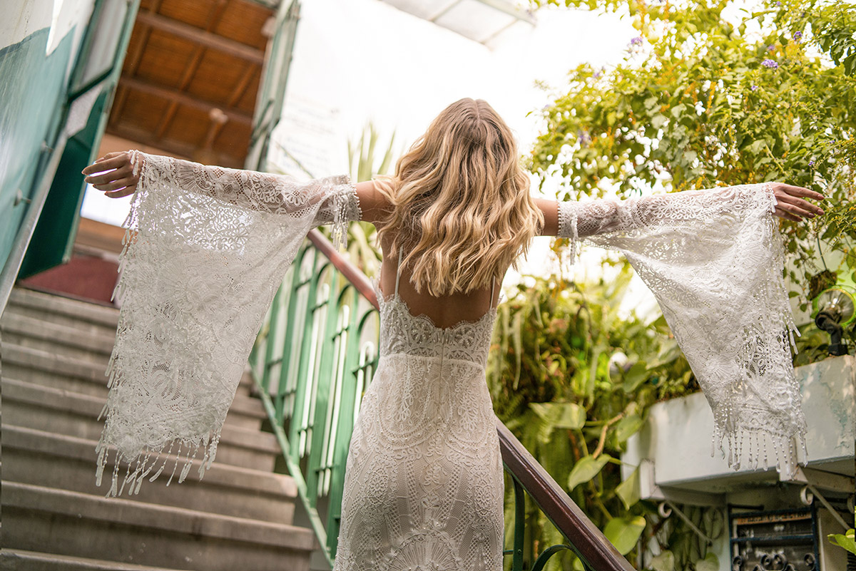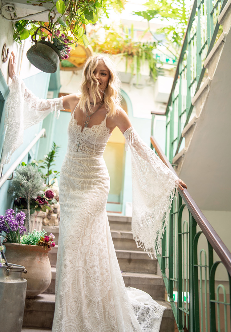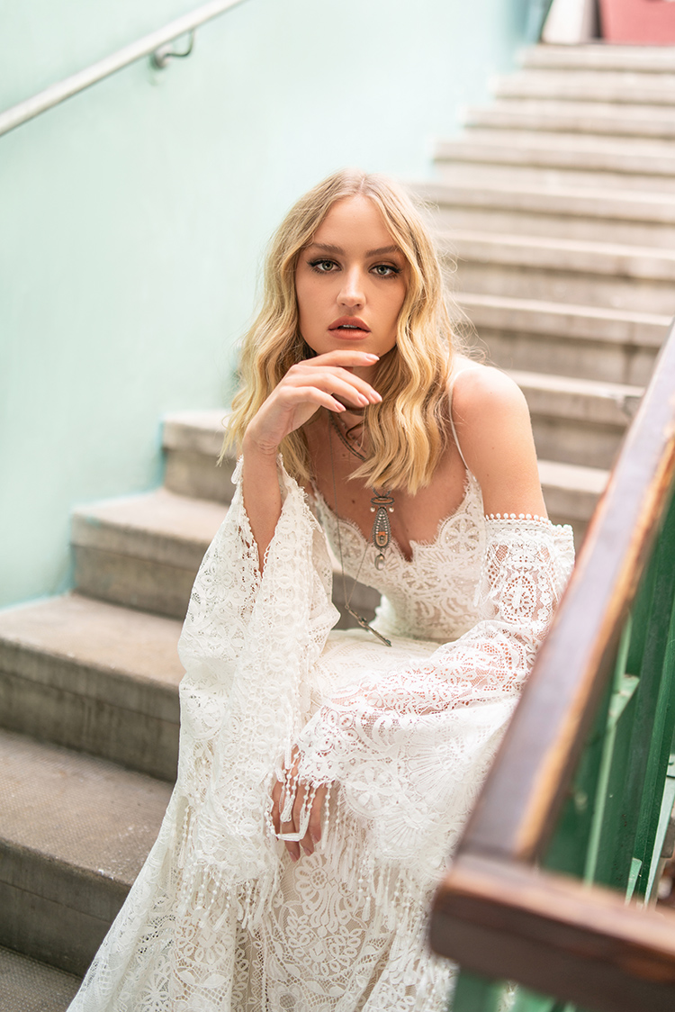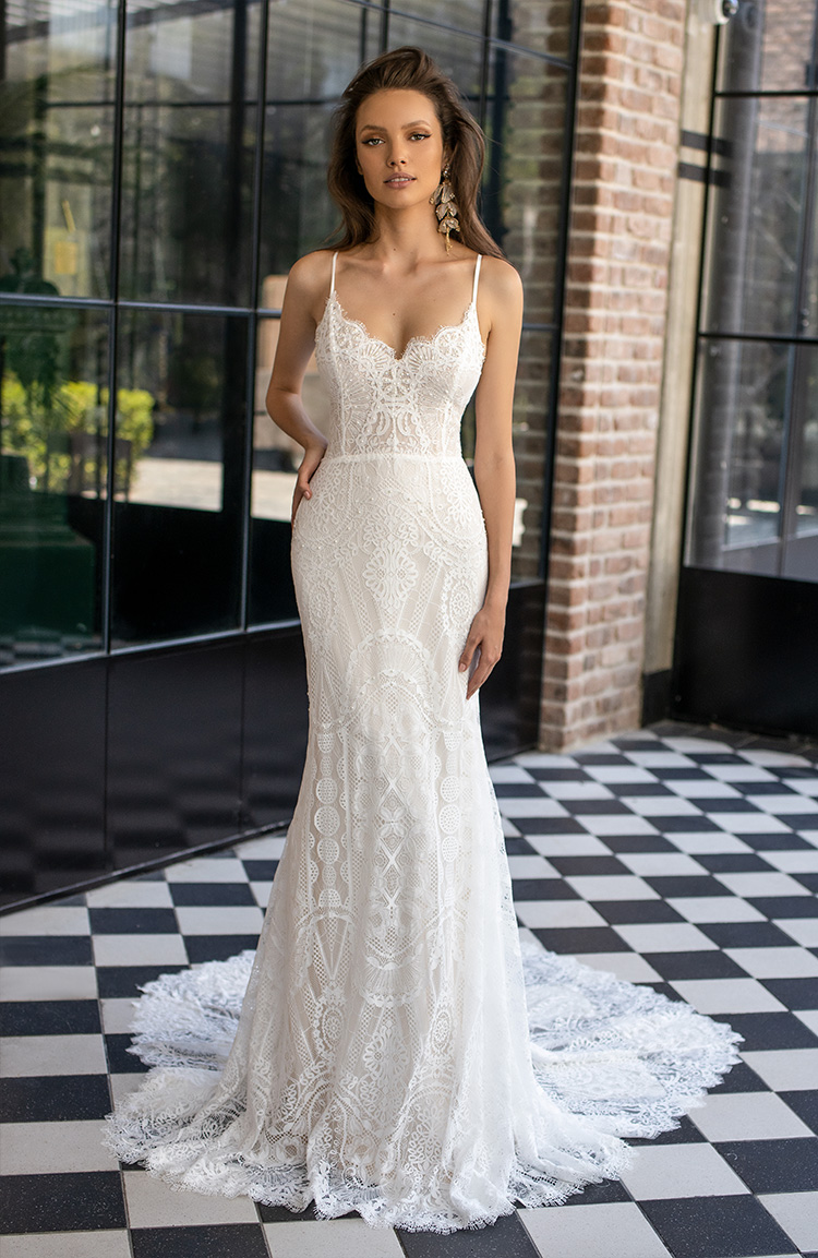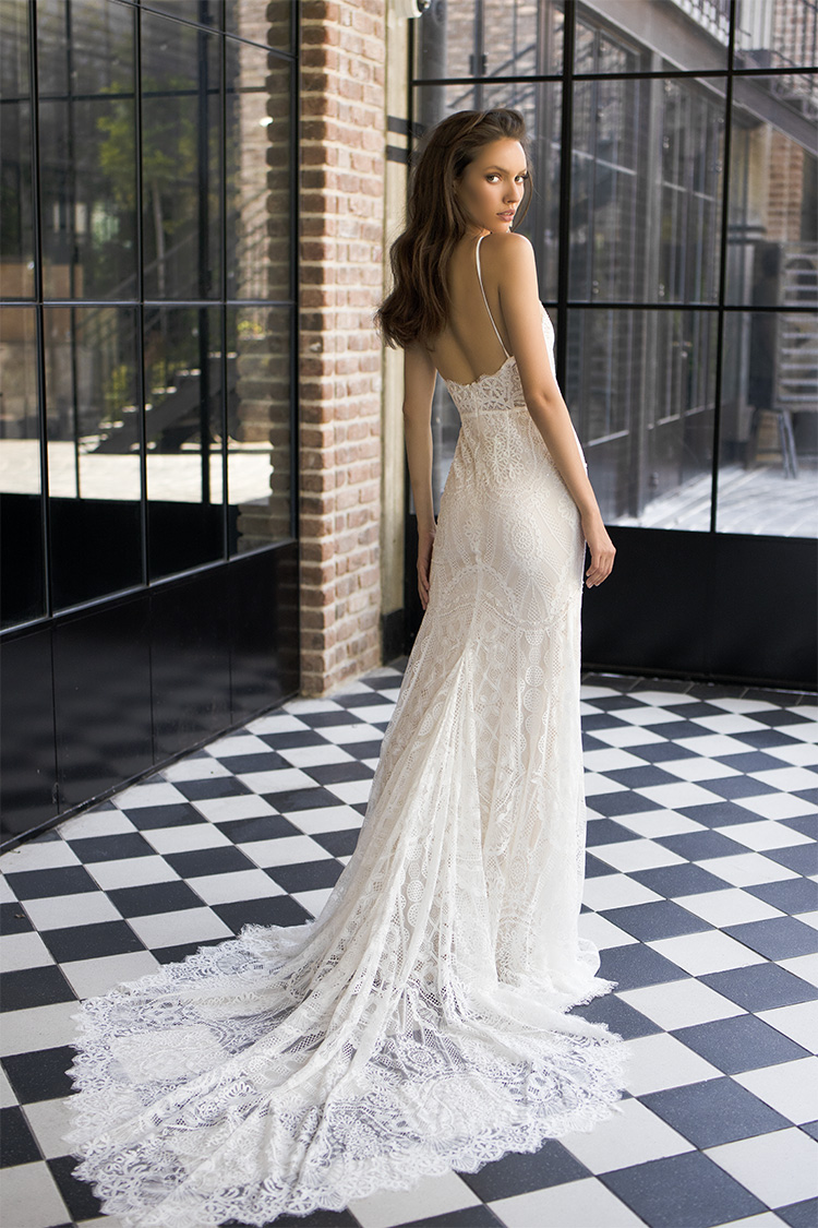 This all lace style hugs every curve from the delicate eyelash lace trimmed bodice to the low back. If you love a beautiful lacy train, you're going to fall in love with Laura! Complete your wedding day look with a slightly messy updo or textured waves, a bronzy brown smokey eye, and don't forget some highlighter on your décolleté!