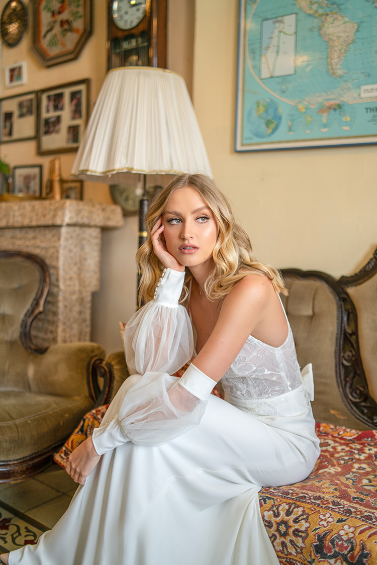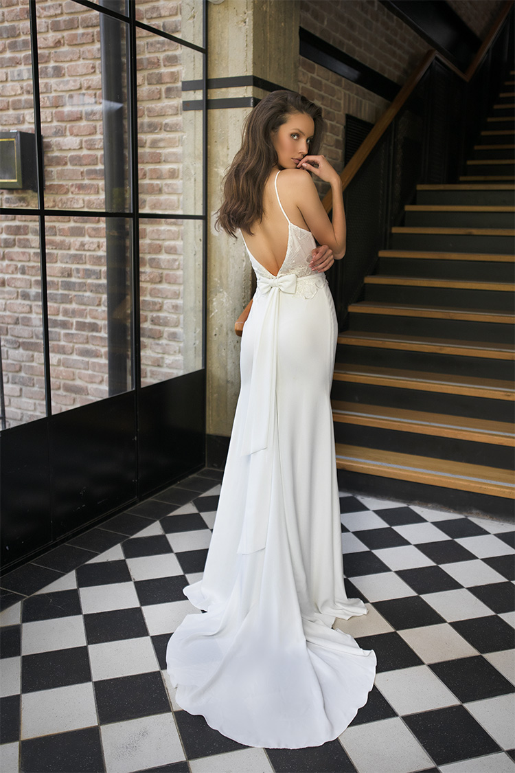 #LevannahByRish from the #RayOfLightByRish Collection is sophisticated, sexy, and sweet all at once. This gown is perfect for the bride who wants to show off her figure. A V-neckline and sleek skirt keep things streamlined, while the thin belt accents the waist. The bow on the back adds a sweet touch and serves to emphasize the stunning low back. The key to rocking this gown? Keep things simple, chic, and beautifully you.