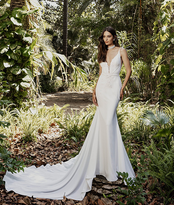 Remy is perfect for the boho minimalist bride. This crepe dress beautifully hugs the body and features flattering seams, embroidered trim, spaghetti straps, and a Rish-developed lace appliqué hand-placed in the center of the front and back bodice. A V-shaped back and simple train finish the gown with classic elegance.