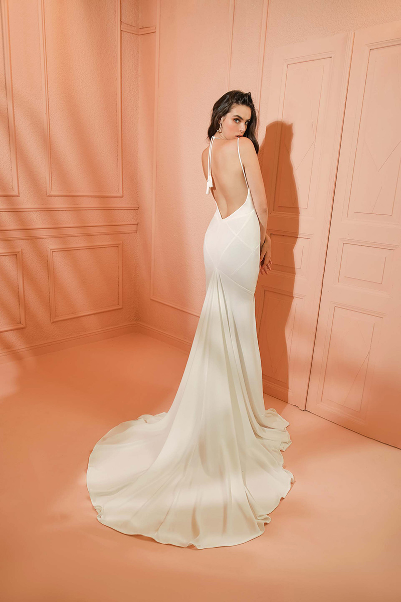 Robin is a smooth, minimalistic, full-crepe fitted silhouette dress with criss-cross inner seams throughout the dress that accentuates the body’s most enchanting features, a low back, V neckline, and a royal train.