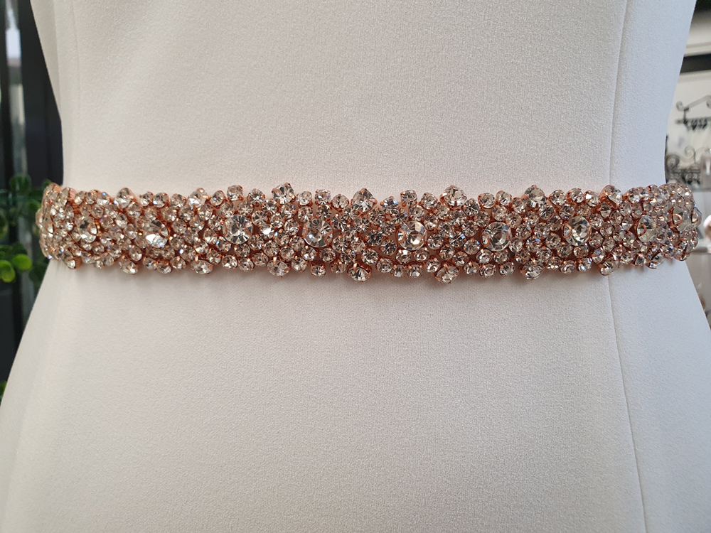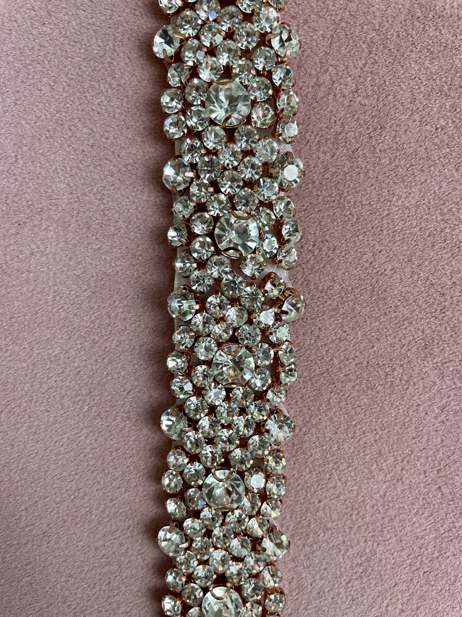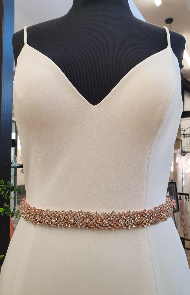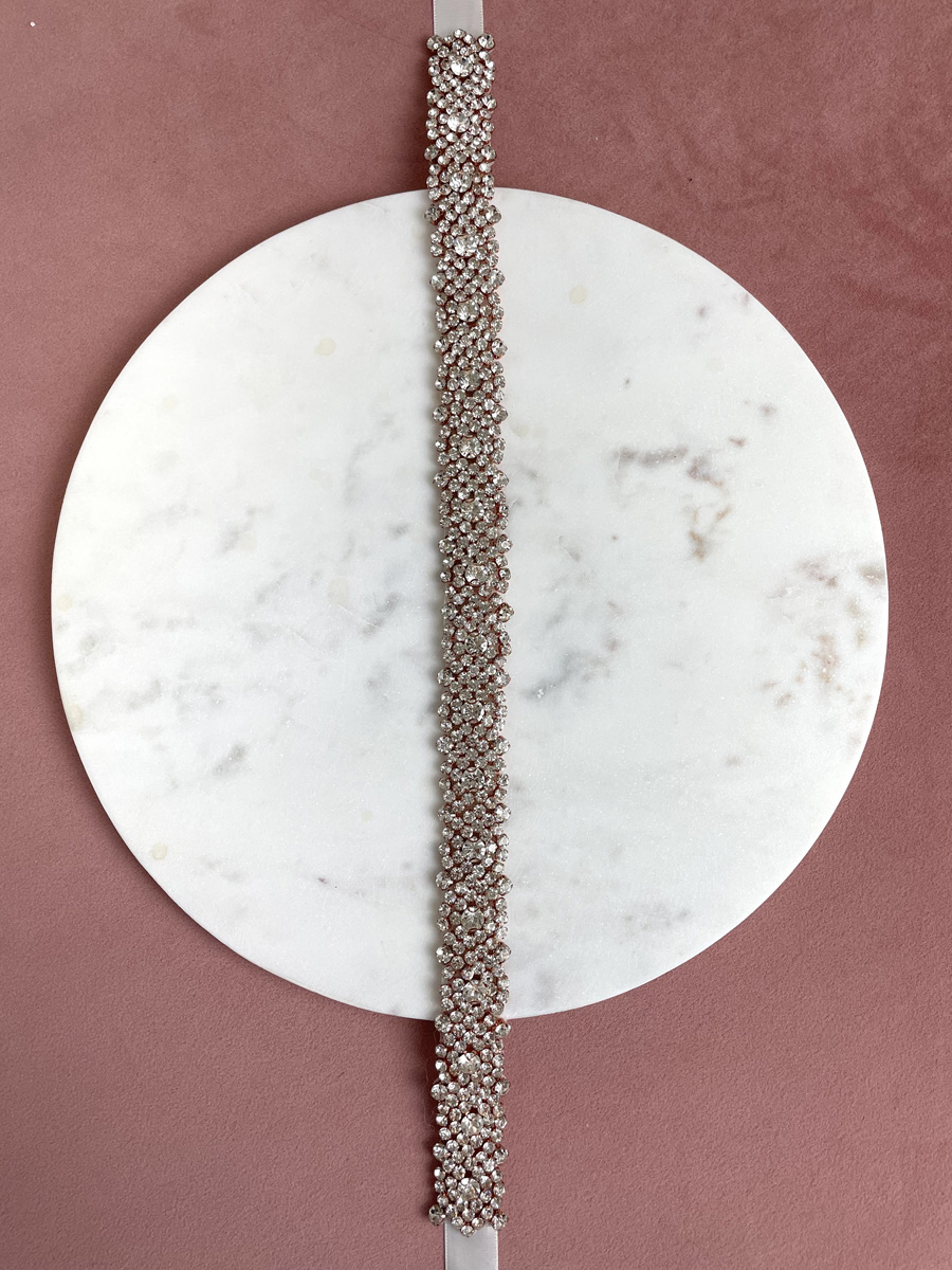Tie belt with a dense diamante embellishment. Easily removed from ribbon to allow direct attachment to your dress (if desired).