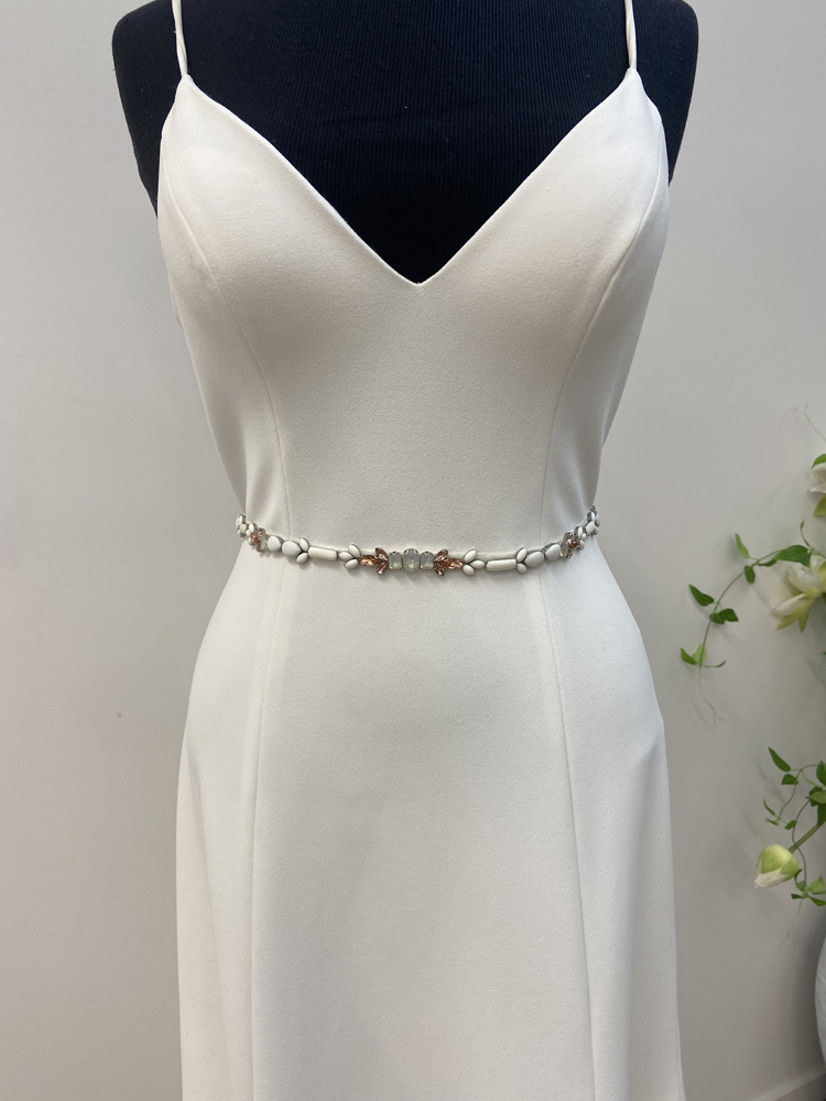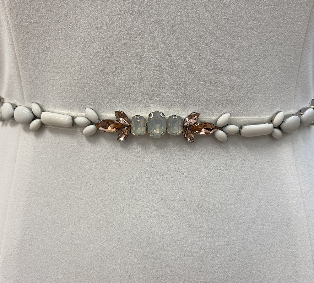 Tie belt with enamelled shapes and a centre of opal and rose gold diamantes. Easily removed from the tie ribbon to be applied directly to your gown.