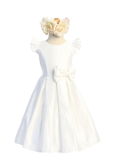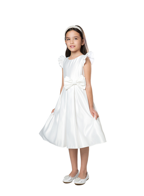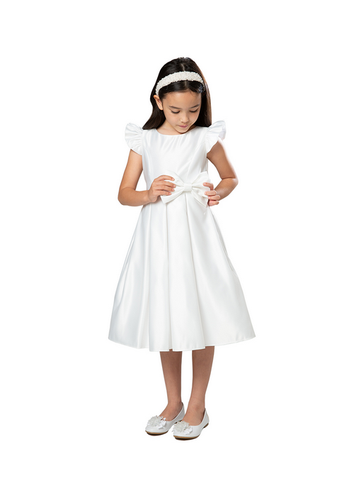 Satin boat neck dress with a pleated skirt. Frilled sleeve and a waist bow.