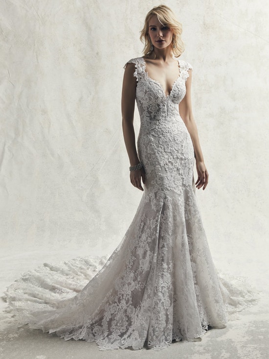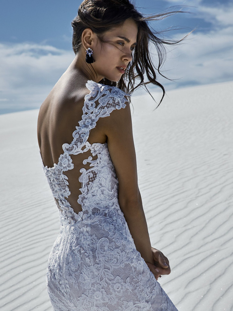 The floral motifs are basically in their natural habitat in this lace cap-sleeve wedding dress, the chicest way to layer a neckline, bodice, and statement back.