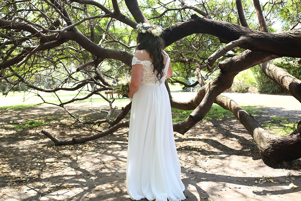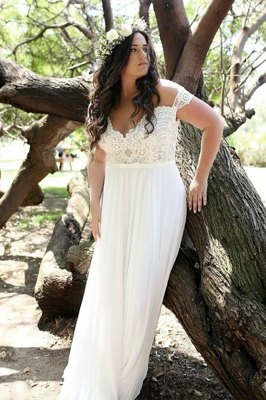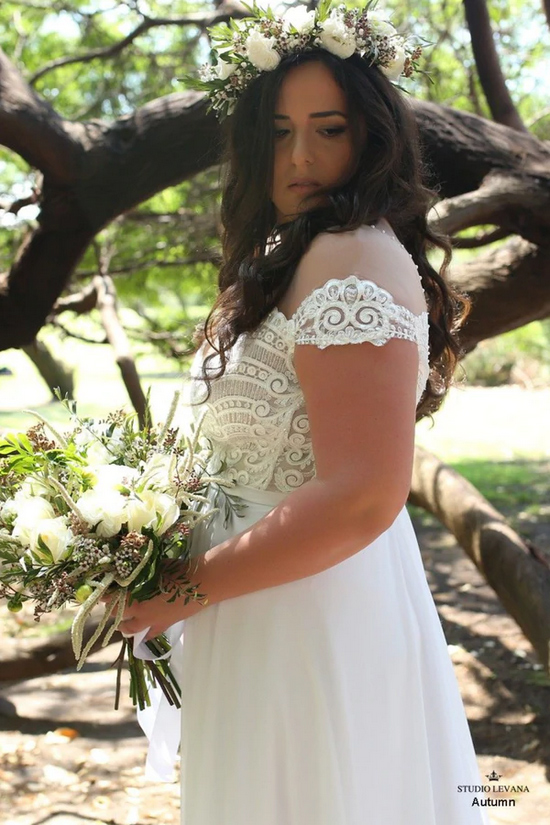 Studio Levana Autumn is a boho chic wedding dress, off the shoulder lace and beaded top with flowing skirt