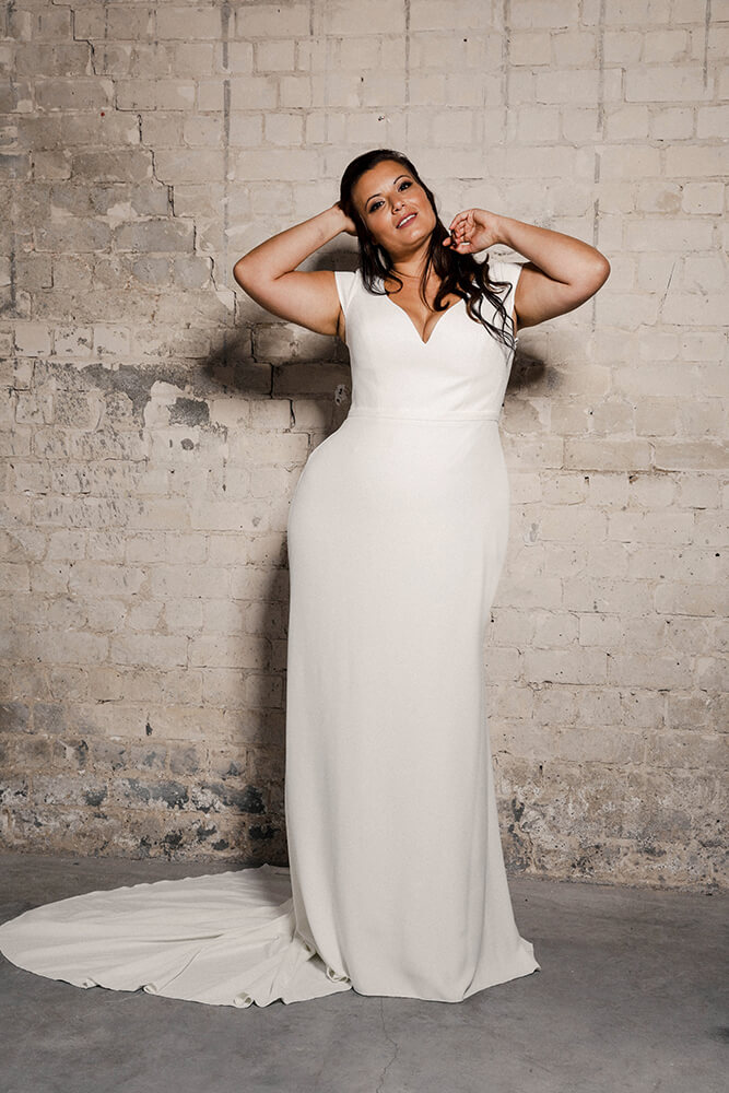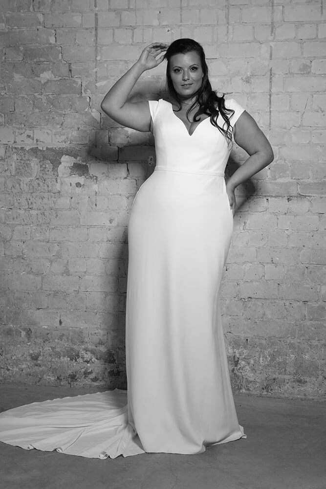 Soft plain crepe mermaid wedding gown with short cap sleeves.