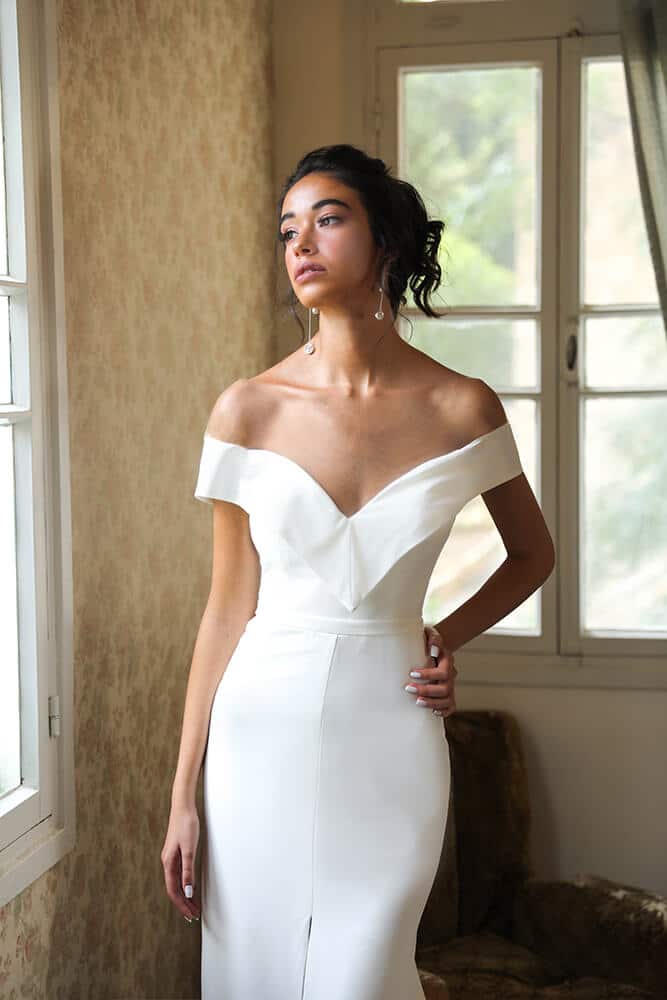 Light crepe mermaid wedding gown with slit and off the shoulder straps that form a bow on the back.
