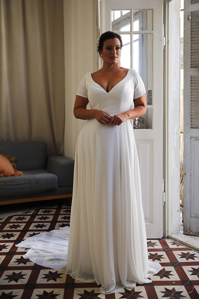 Studio Levana Paris Sunset features a High plunging bodice with wide straps flowing into a chiffon circle cut skirt.