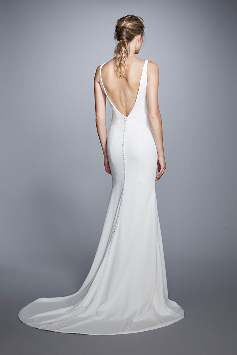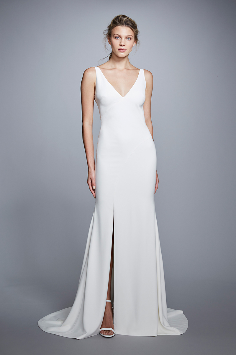 V-neck crepe gown with curved asymmetrical seams and side split.