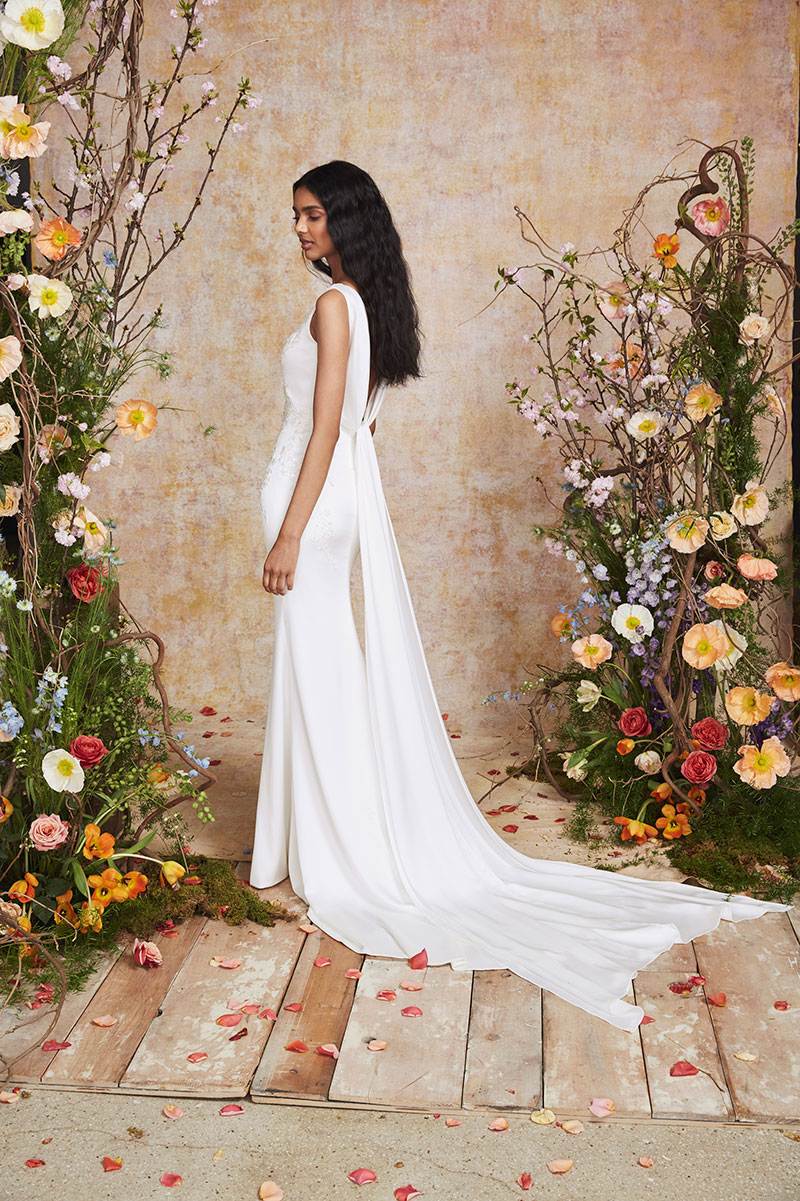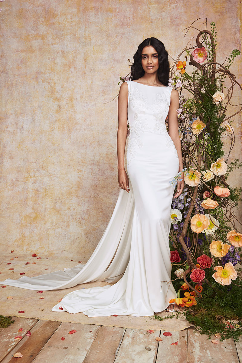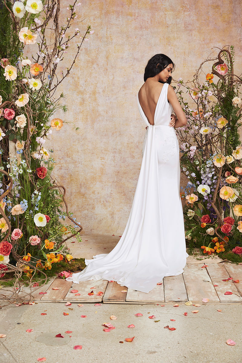 Bateau neck satin sheath wedding gown with scattered lace appliques and knotted cowl back.