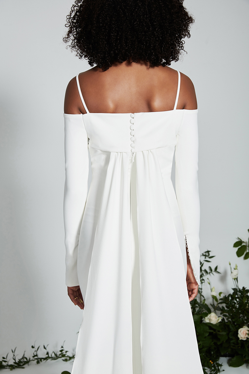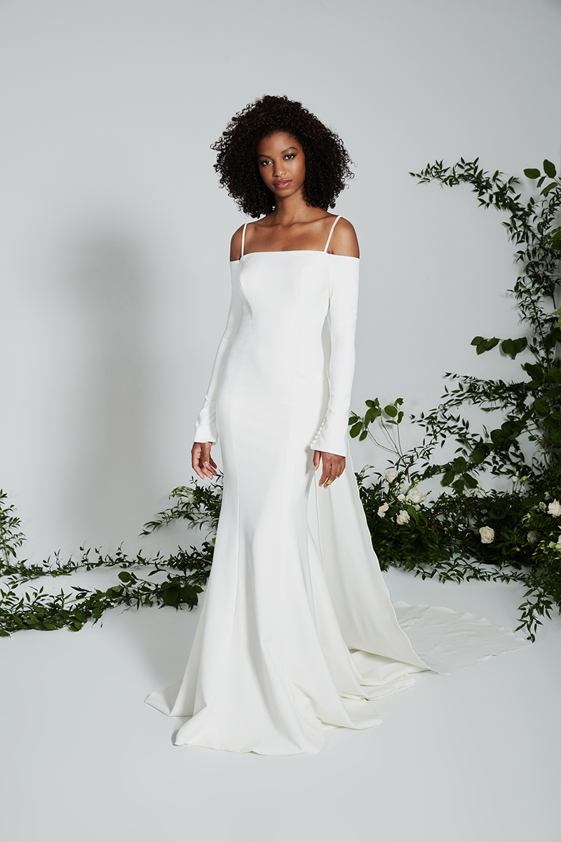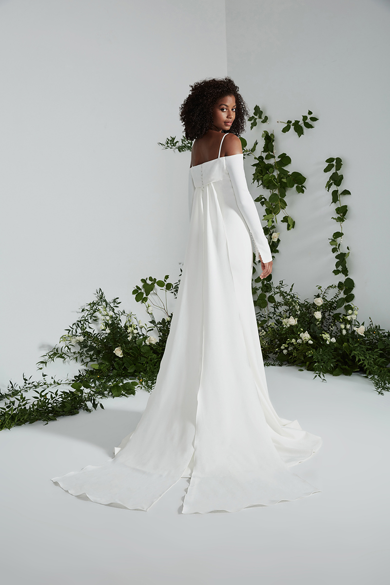 Crepe cold shoulder siren gown with detachable watteau train and sleeves.