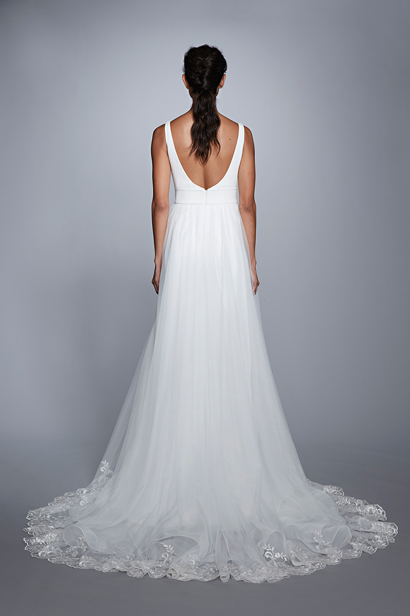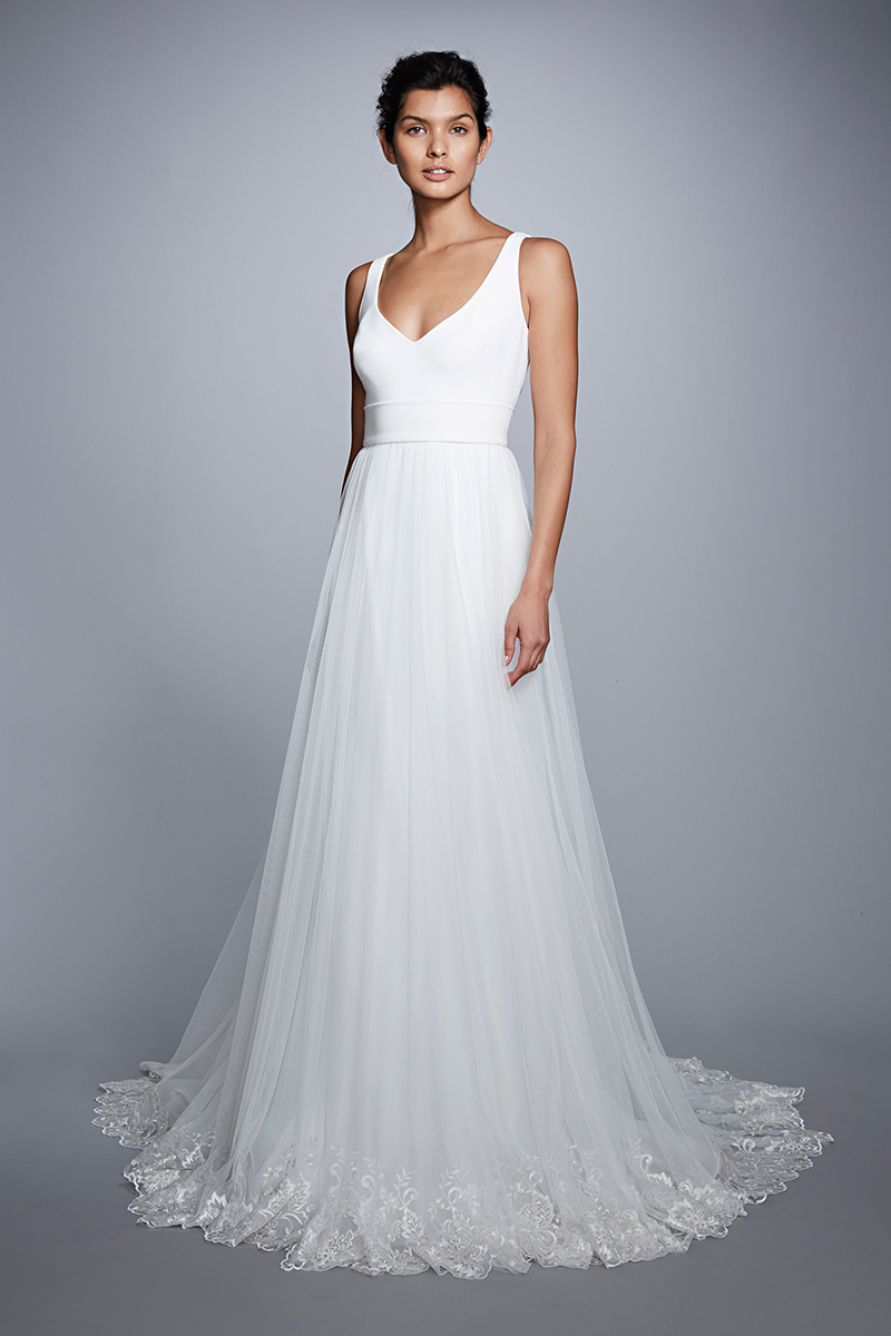 Theia Couture Daisy. Spade neckline, stretch crepe bodice with tulle ball gown skirt and lace appliqués at hem.