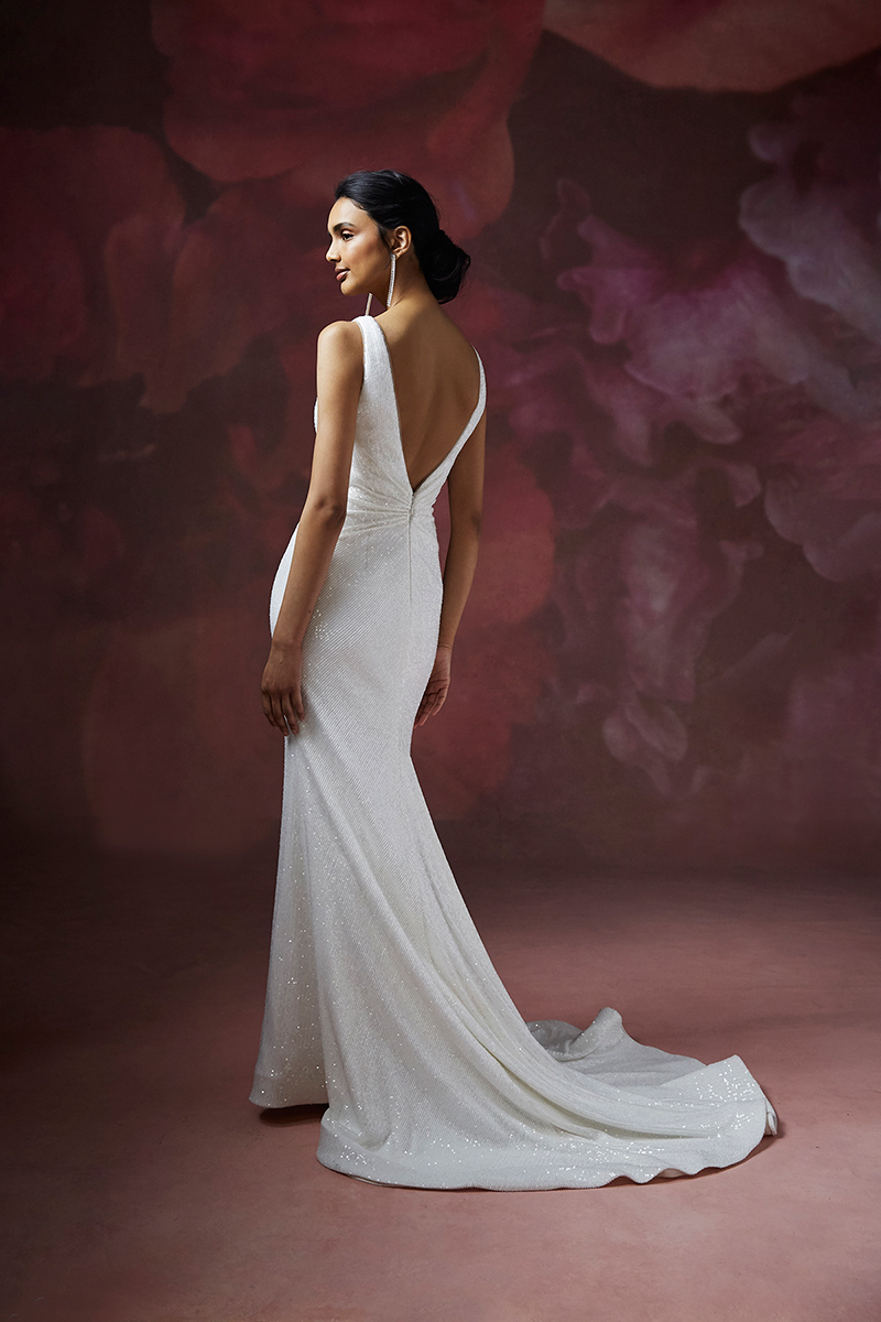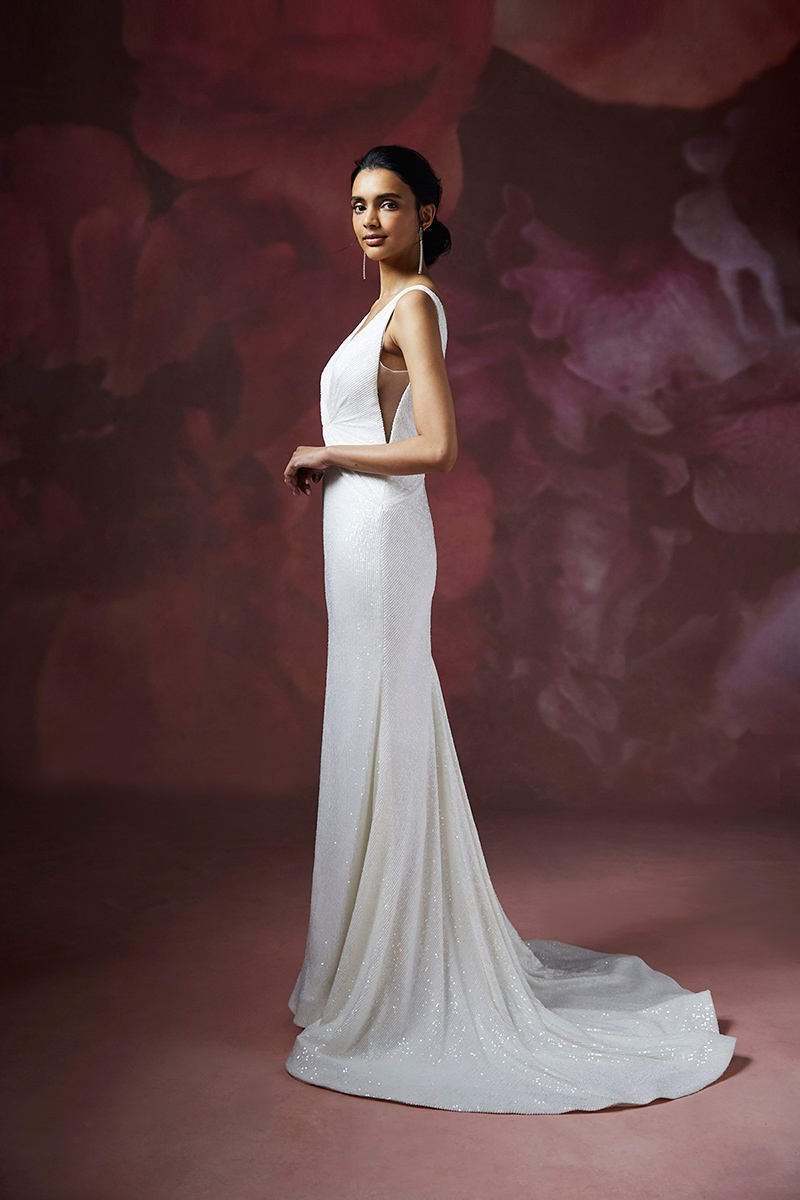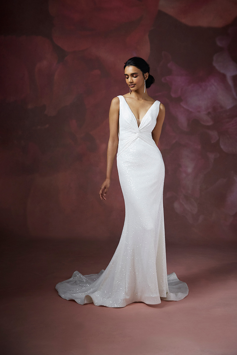 Deep v neck, back and side luxe sequin sheath gown with twisted bodice