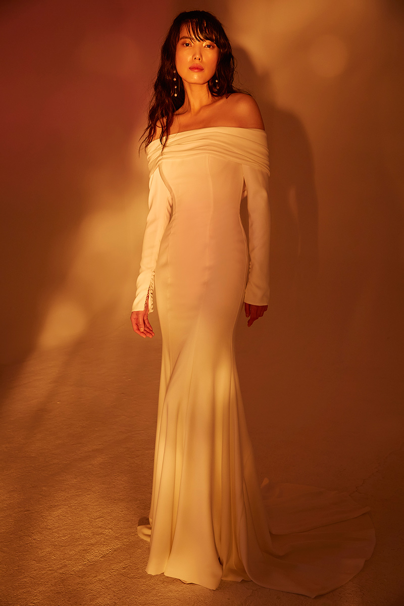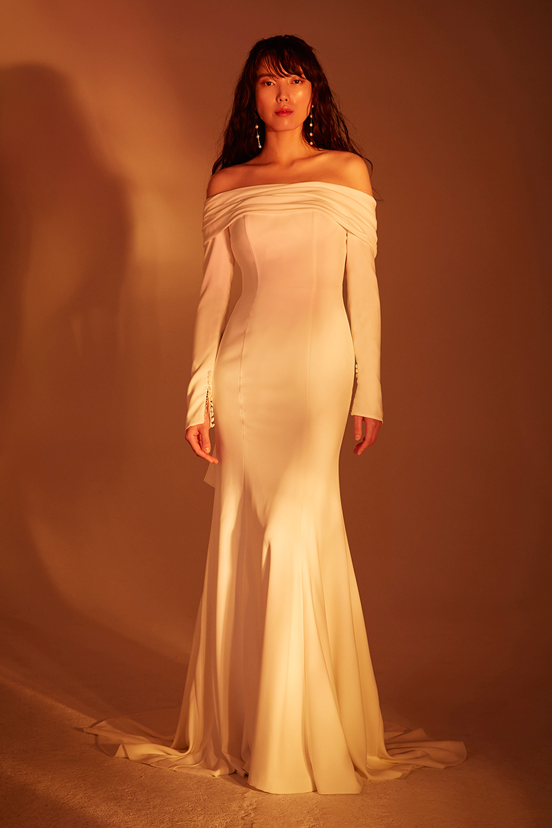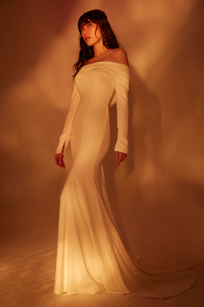 Off the shoulder draped long sleeve stretch crepe siren gown with asymmetric twist train