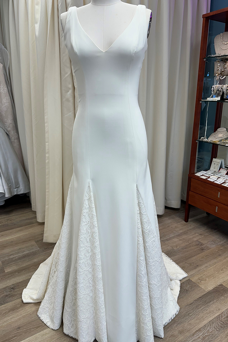 v-neck stretch crepe a-line gown with princess seams and guipure lace godets and criss-cross back detail.