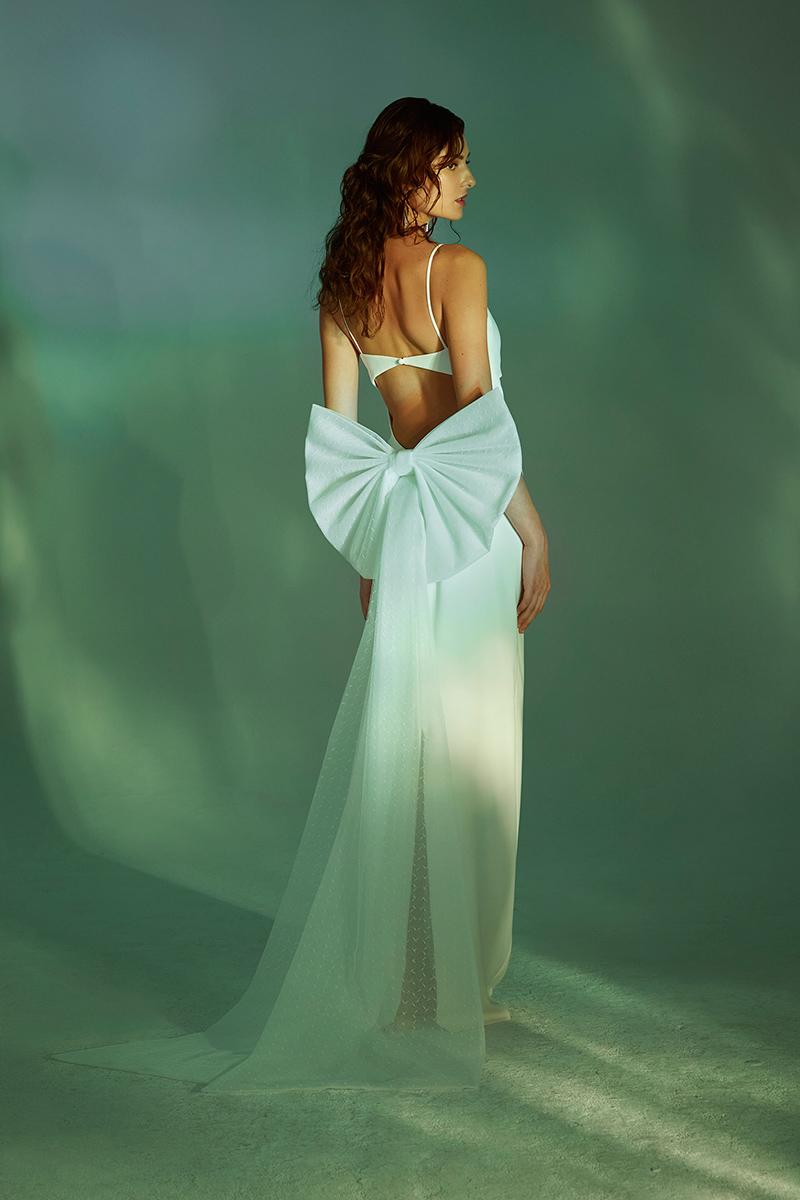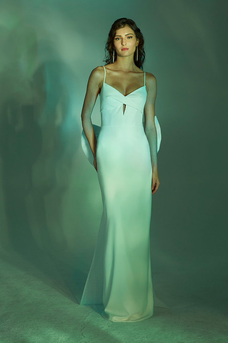 Open back column spaghetti strap gown with cut out and detachable swiss dot bow