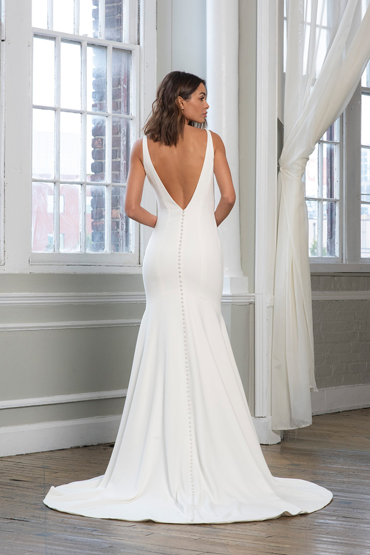 Lynda by Theia Couture V neck crepe gown with low back and covered buttons