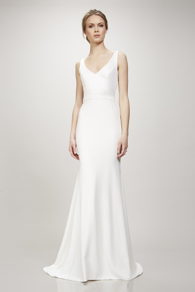 Undeniably timeless, this V-neck satin bodice has a natural sheer that takes center stage. Combined with a flared skirt, fitted at the waist in stretch crepe which streamlines the natural curves of your silhouette while creating an impactful statement