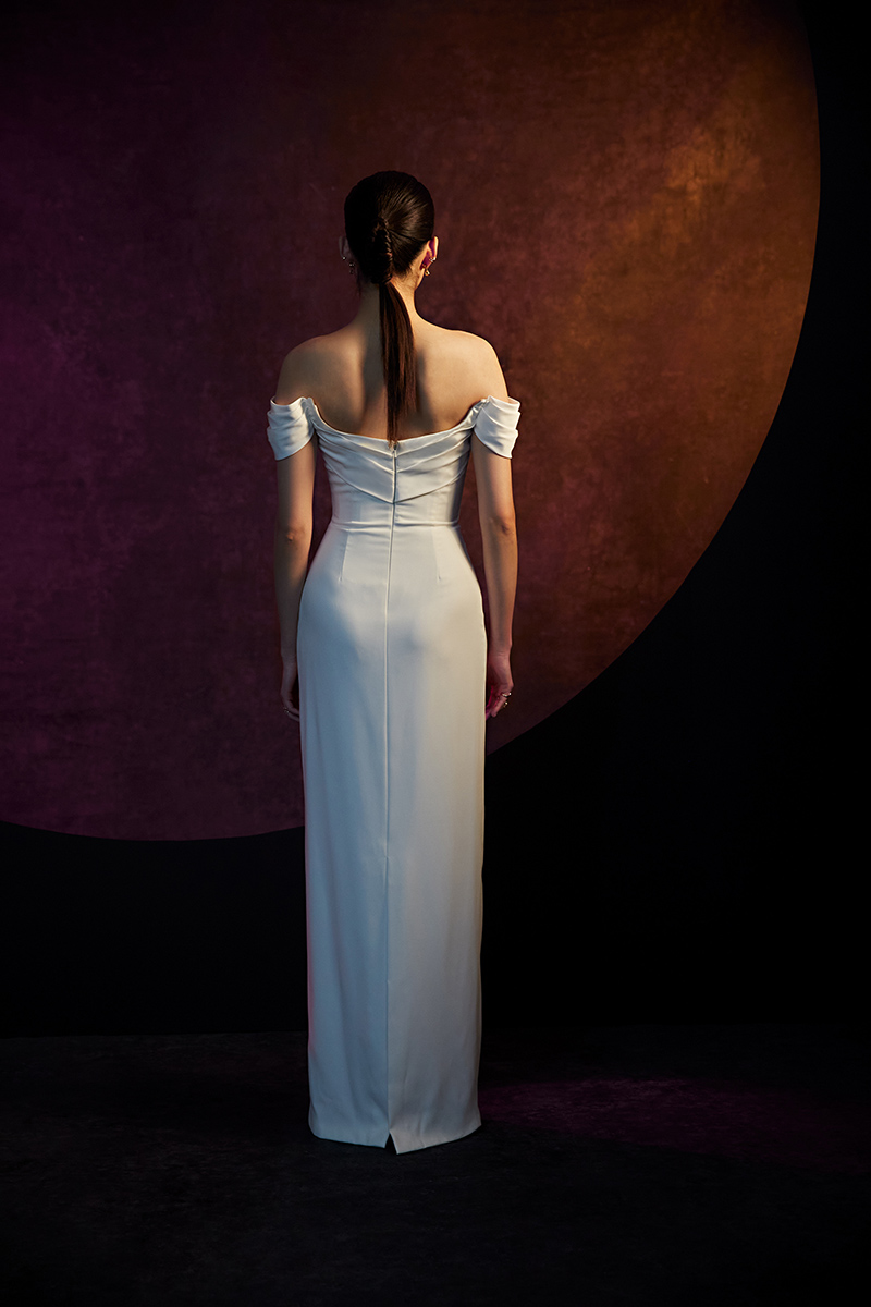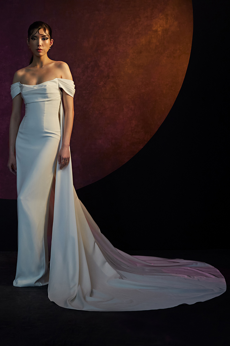 Mikado and crepe off the shoulder gown with detachable watteau train