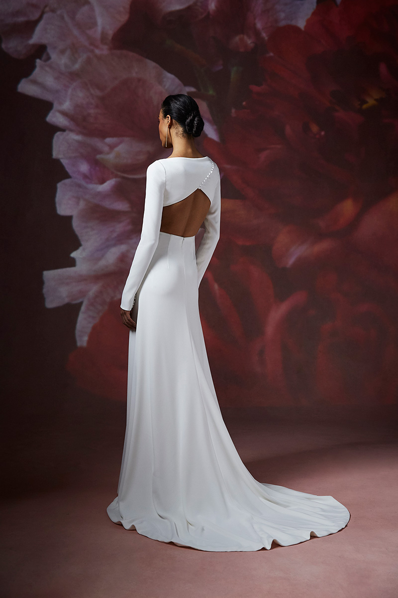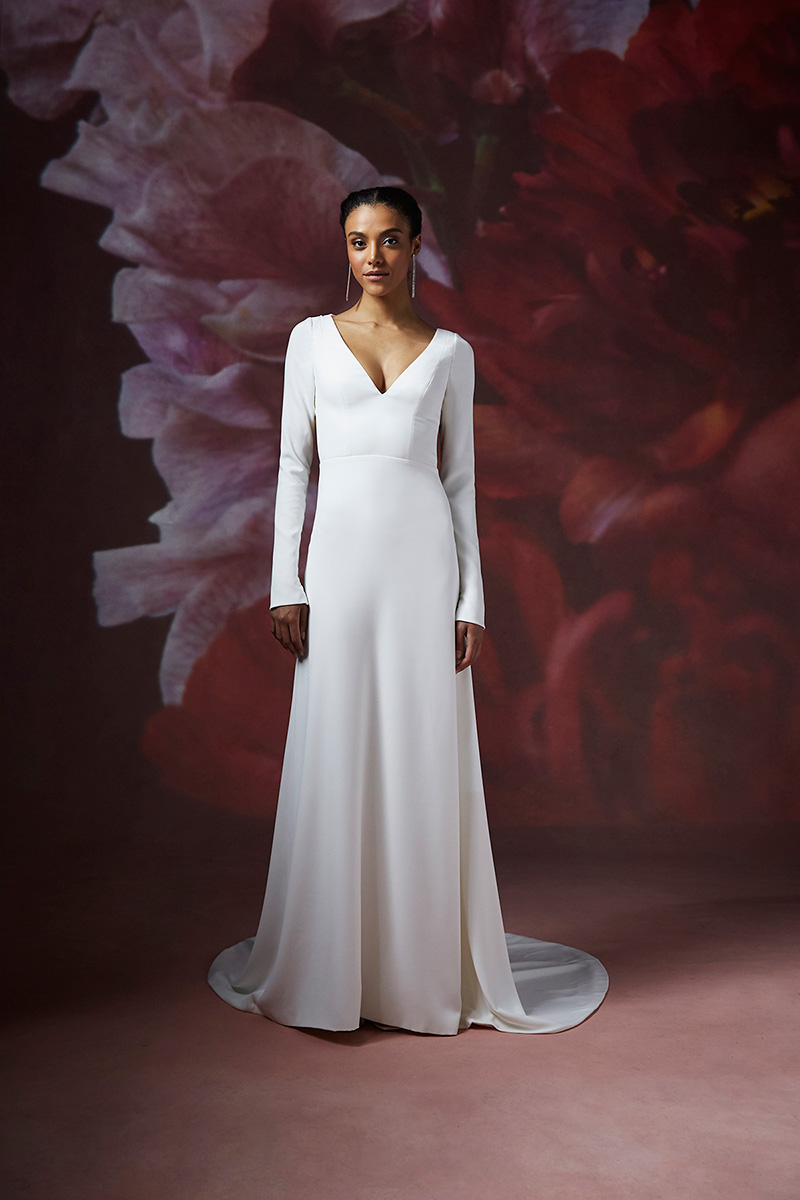 V neck stretch crepe modified a line gown with asymmetrical latch back detail and sleeves