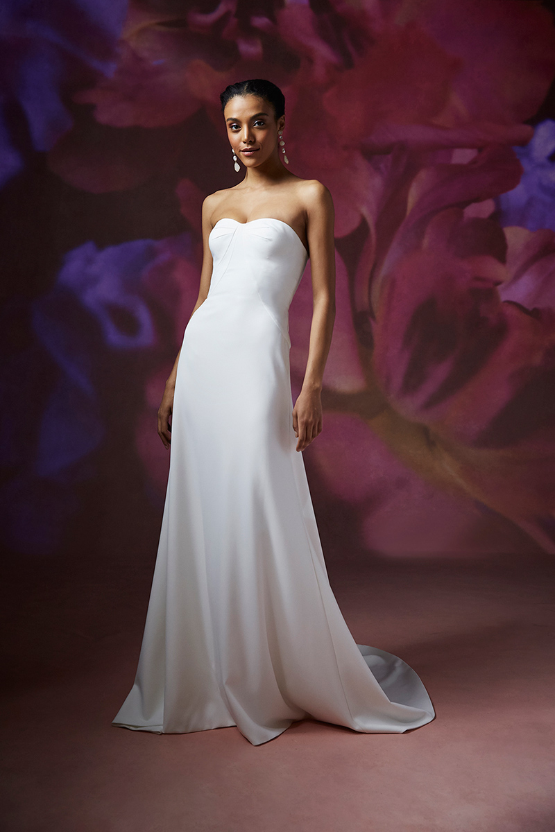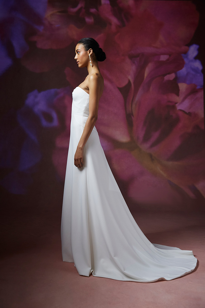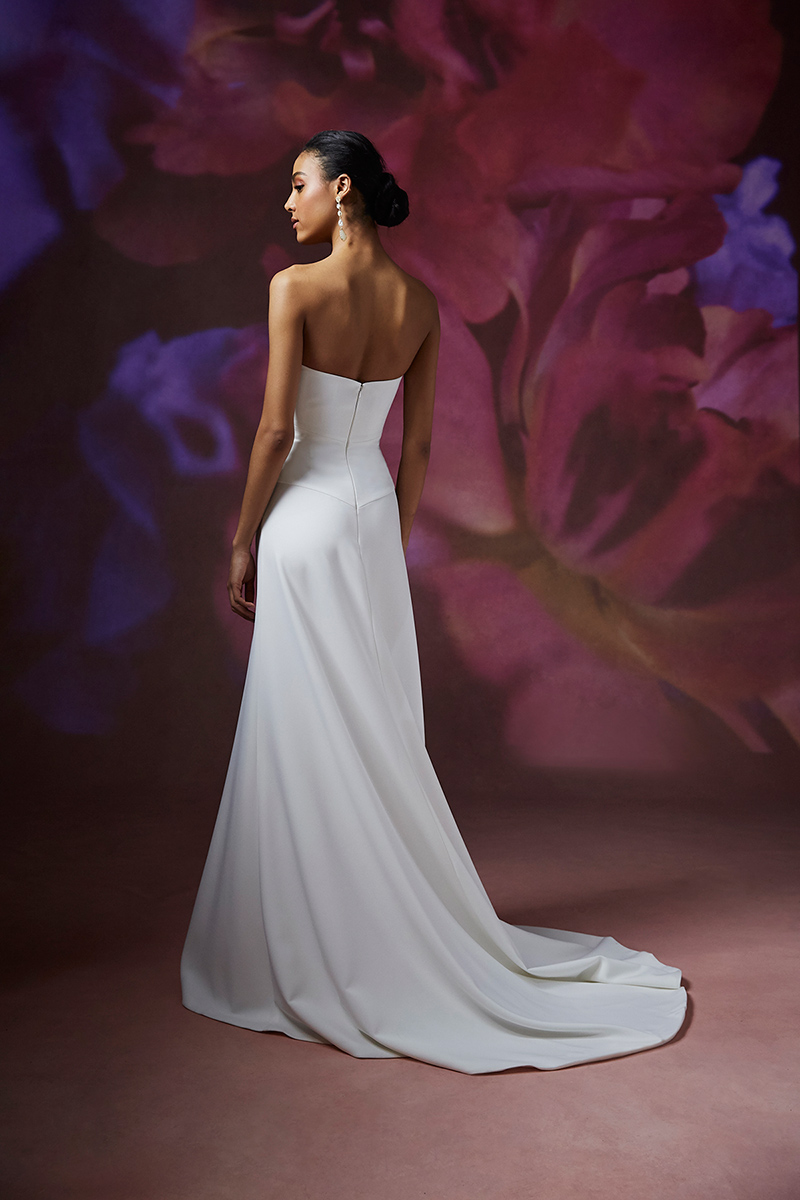 Notched sweetheart stretch crepe strapless gown with symmetrical contour seaming